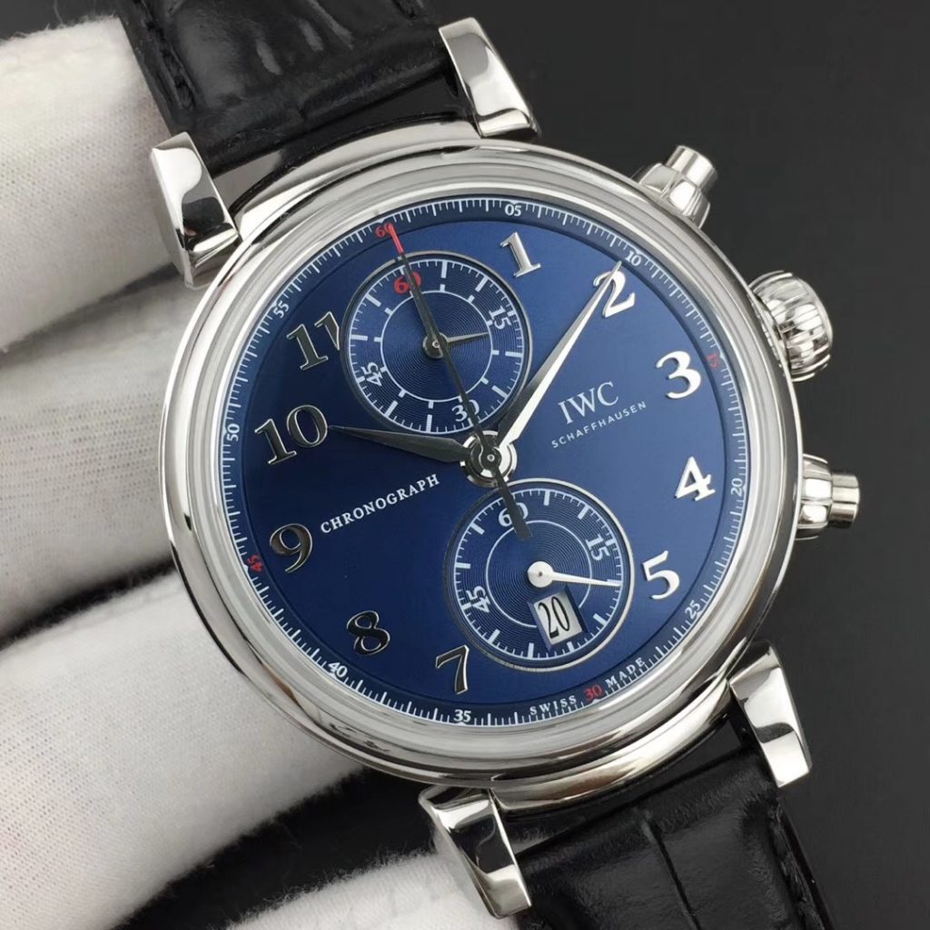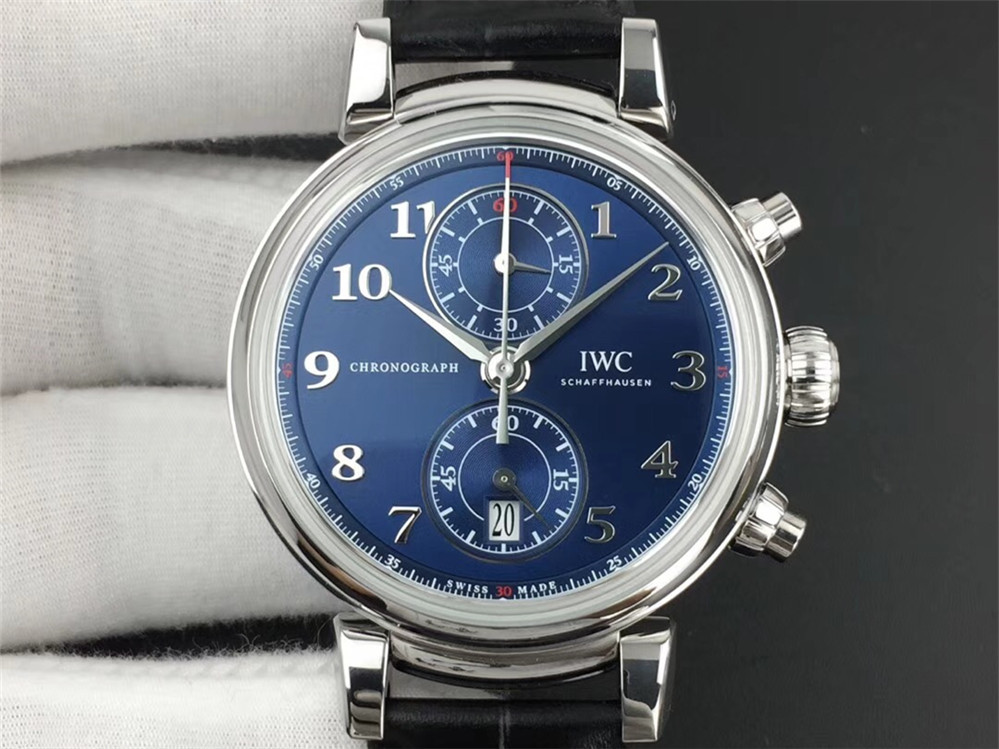 The top replica edition of IWC Da Vinci series IW393402 Laurance special version watch is produced by ZF factory, and the whole watch perfectly restore the outer appearance design and inner function structure. The replica watch diameter is 42mm, the watch mirror made of true sapphire crystal glass, and processing anti-glare technology treatment. The dial color is laid out in bright blue, all time marks and scales are marked by Da Vince series style figures. 12 o’clock position is set a functional small dial that equipped timing minute hand and timing hour hand, 6 o’clock position is set a small functional dial with normal small seconds and calendar display, and two small dials both adopt circle pattern structure with prominent texture.