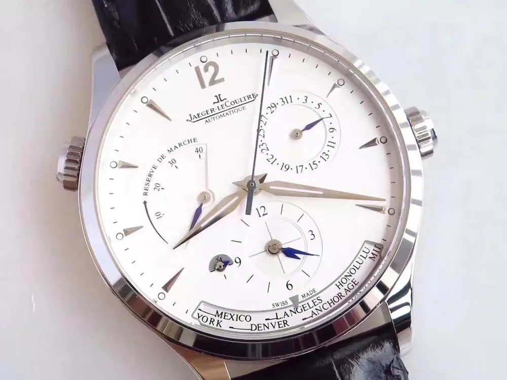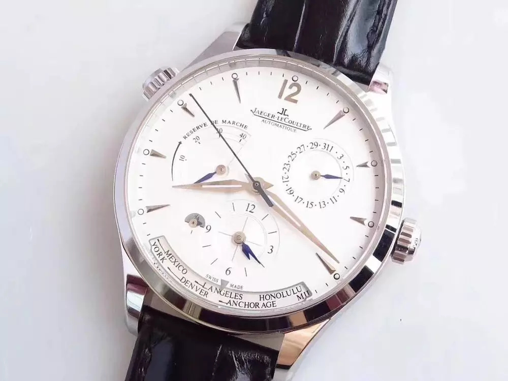 At present Jaeger-LeCoultre Master Geographic series watches have two style for your choice, precious steel style and rose gold style. Jaeger-LeCoultre Master series watch is a classical model of watches and clocks classics, because of its neat lines, elegant modeling and practical function. Jaeger-LeCoultre Master series expressed the elegant tradition of watches and clocks, and classical aesthetic design combination technical performance. And it exhibits the quality and reliability of Jaeger-LeCoultre factory researched and developed movement. Jaeger-LeCoultre Master series watch started to accept “1000 hours testing”in 1992, and the technical standard established therein is becoming every Jaeger-LeCoultre watch must pass standard today.