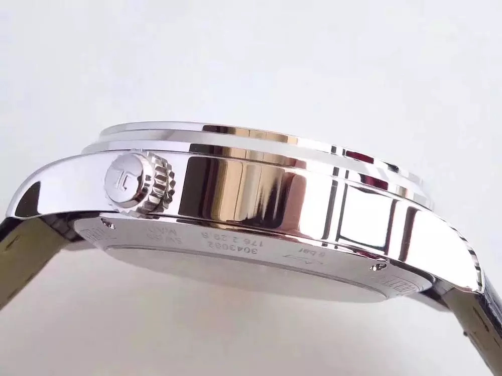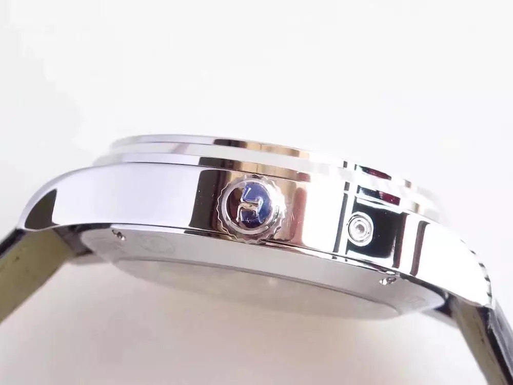 This replica Jaeger-LeCoultre Master Geographic series adopt specious steel forging watch case and 39mm diameter design. And this watch have power reserve display function, pointer style date display and 24 hours display. From our picture we not only can see JL logo on precious steel watch crown, but also we can see the quick-adjust button on 2 o’clock position, and it is the button used for quick adjust date.