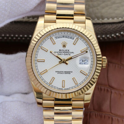 Rolex DayDate – 1:1 Best Edition Replica Watches,The Rolex Day-Date watch has the reputation of being a presidential watch, which has attracted the love of countless watch enthusiasts, including myself. The Rolex Day-Date replica watch I bought was from the GM factory and the AR factory. Because I like to compare, I bought two different factories. The first person to receive the package was from the GM factory, which felt very heavy when held in their hands. They did a great job in balancing the weight. They have ready-made tungsten alloy powder metallurgy technology, which makes high-density tungsten steel into a circular inner liner and inserts it into the inner side of the middle shell. This not only does not block the movement, but also adds more than 50 grams to the entire watch at once. They call this idea “Weight+”. The stability of the movement is extremely strong, and there is a saying circulating in the industry that the Rolex Day-Date replica watch from GM factory will only wear out, not break. We use 904L stainless steel, and the brushed and polished transition of the strap edge meets the authentic standards. Regarding the electroplating of the tooth ring, the precious metal color electroplating layer has a thickness of 0.3 µ m, followed by a layer of nano DLC, which can achieve color retention within six months. Pursuing stability Rolex Day-Date replica watch, GM factory is the best choice. We see AR factory again, they use Wu Jingang material, undergo careful electroplating process, highly restore the authentic appearance, and are equipped with the new generation 3255 movement, providing strong power support for the watch. By optimizing the design of the escape wheel and escape fork, the transmission efficiency of the movement has been improved, resulting in an astonishing 70 hour power reserve for the watch.
