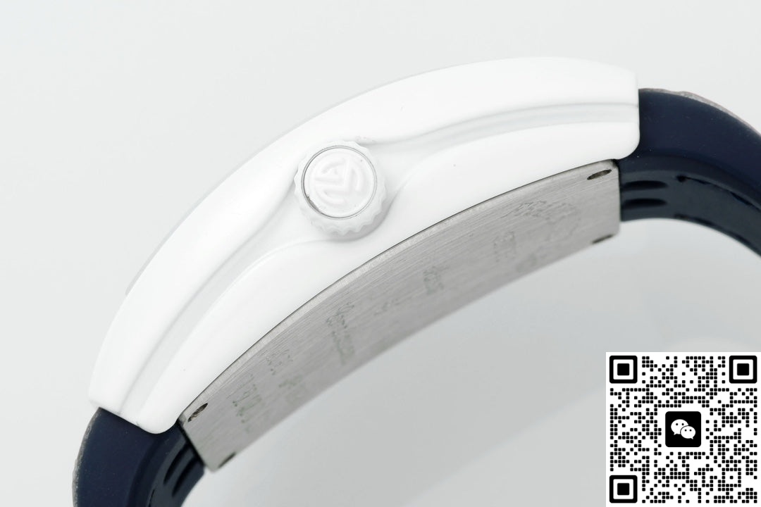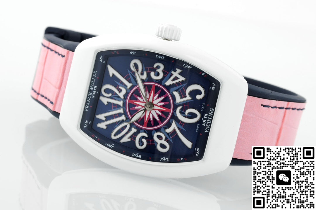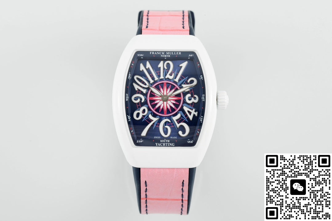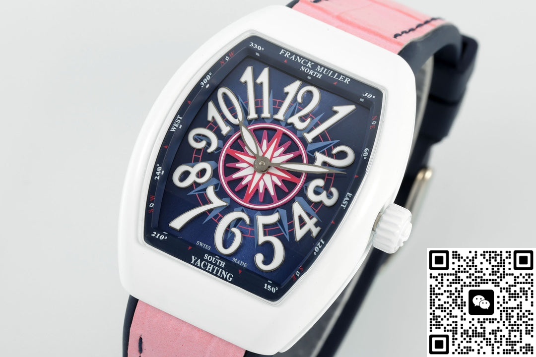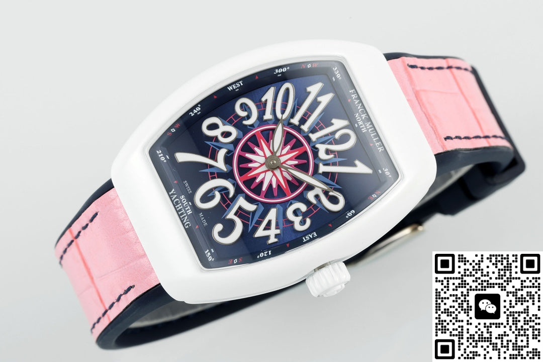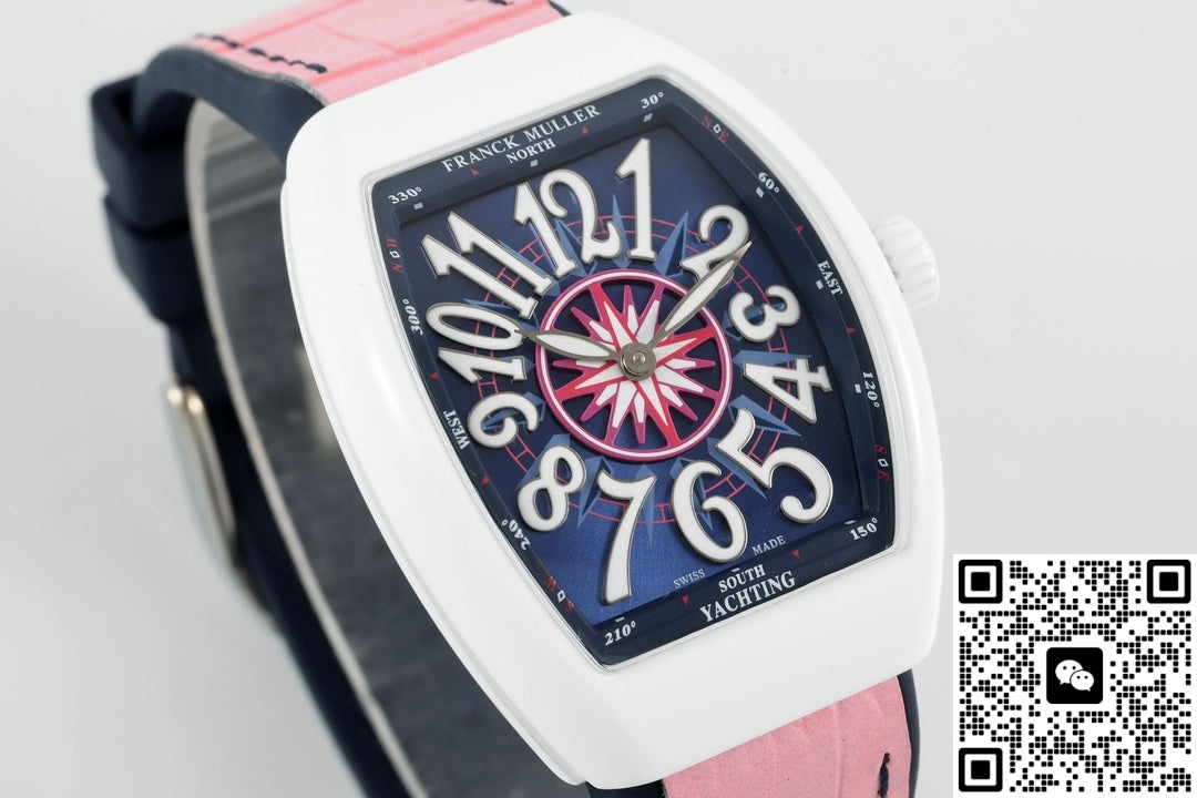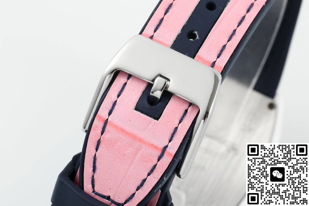 This Franck Muller V32 replica watch has an extremely high recognition rate. The white case in the shape of a wine barrel, paired with a deep blue dial and eye-catching white hour markers, and the pink strap adds a touch of vitality and playfulness. The hand feel is very good and the watch has a strong presence. The Franck Muller V32 series of watches is specially designed for women. There are many styles, each with its own unique features, and they are very popular among watch enthusiasts. This Franck Muller V32 watch from the ABF factory has a good overall texture. It looks finely crafted and is not the kind of perfunctory workmanship. Moreover, the watch works quite smoothly. Its overall performance is quite good. Let’s take a look together.