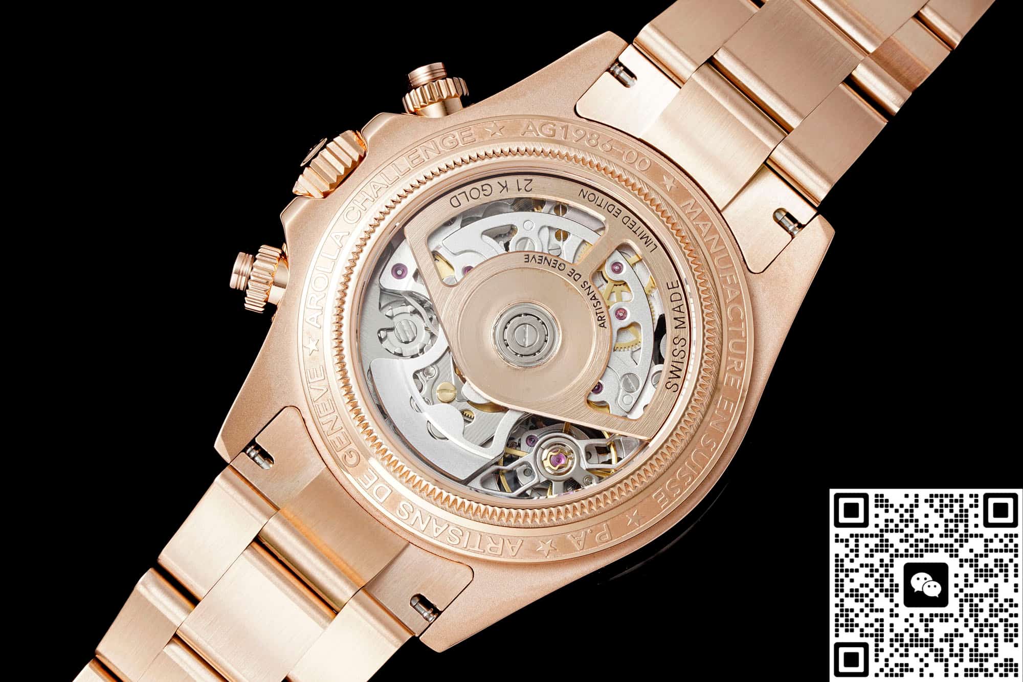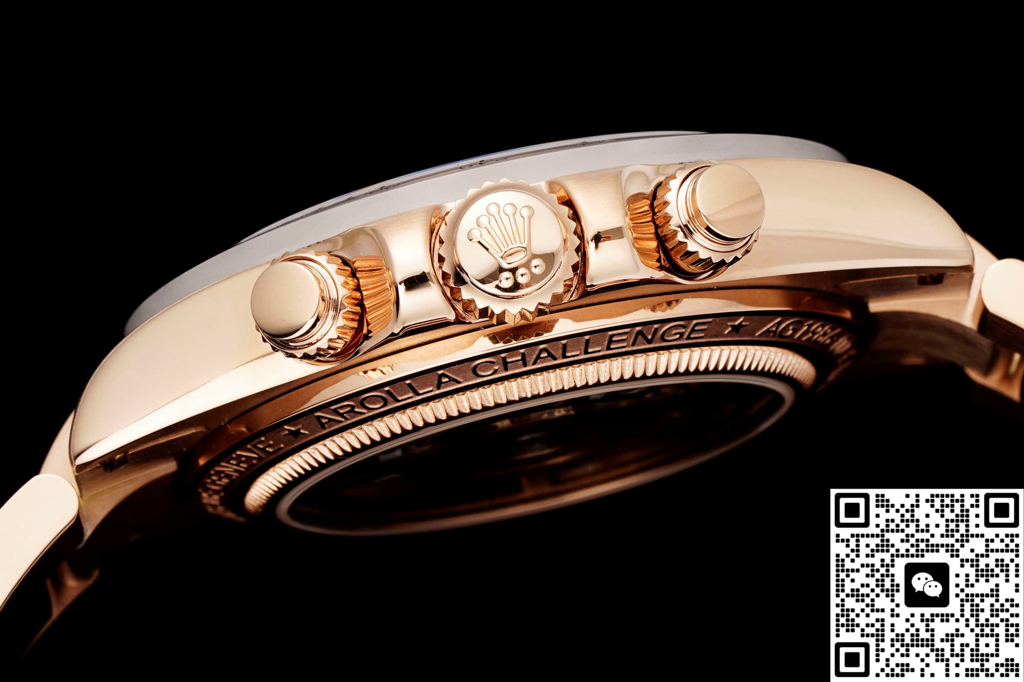 This ADG Factory Rolex Daytona Rose gold 1:1 Best Edition Replica Watch is very close to the original in terms of craftsmanship details and overall polishing. However, the low-quality versions differ greatly from the originals in many details. When purchasing, pay close attention to the polishing process of the case, the printing quality of the dial, the hands and other details. This is the most direct way to identify quality. As the saying goes, it is in the details that the true quality is seen. Details often reflect the overall quality of a product. Although the price of replica is relatively affordable, one should not only focus on the price but also pay more attention to the quality and performance of the product. When purchasing, please choose a reliable Chinese replica watch website. This will not only guarantee product quality, but also provide after-sales service to enhance your shopping experience.