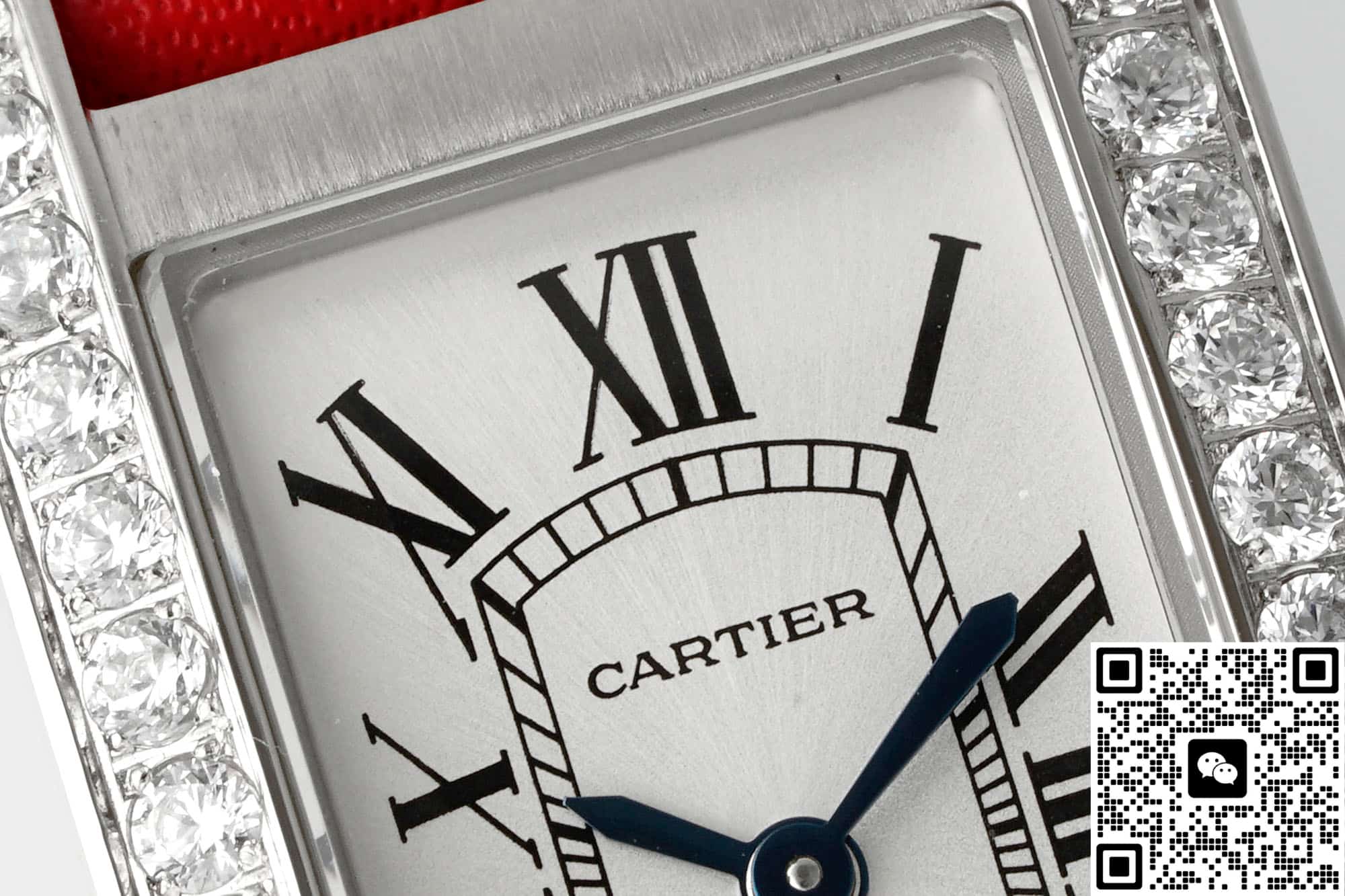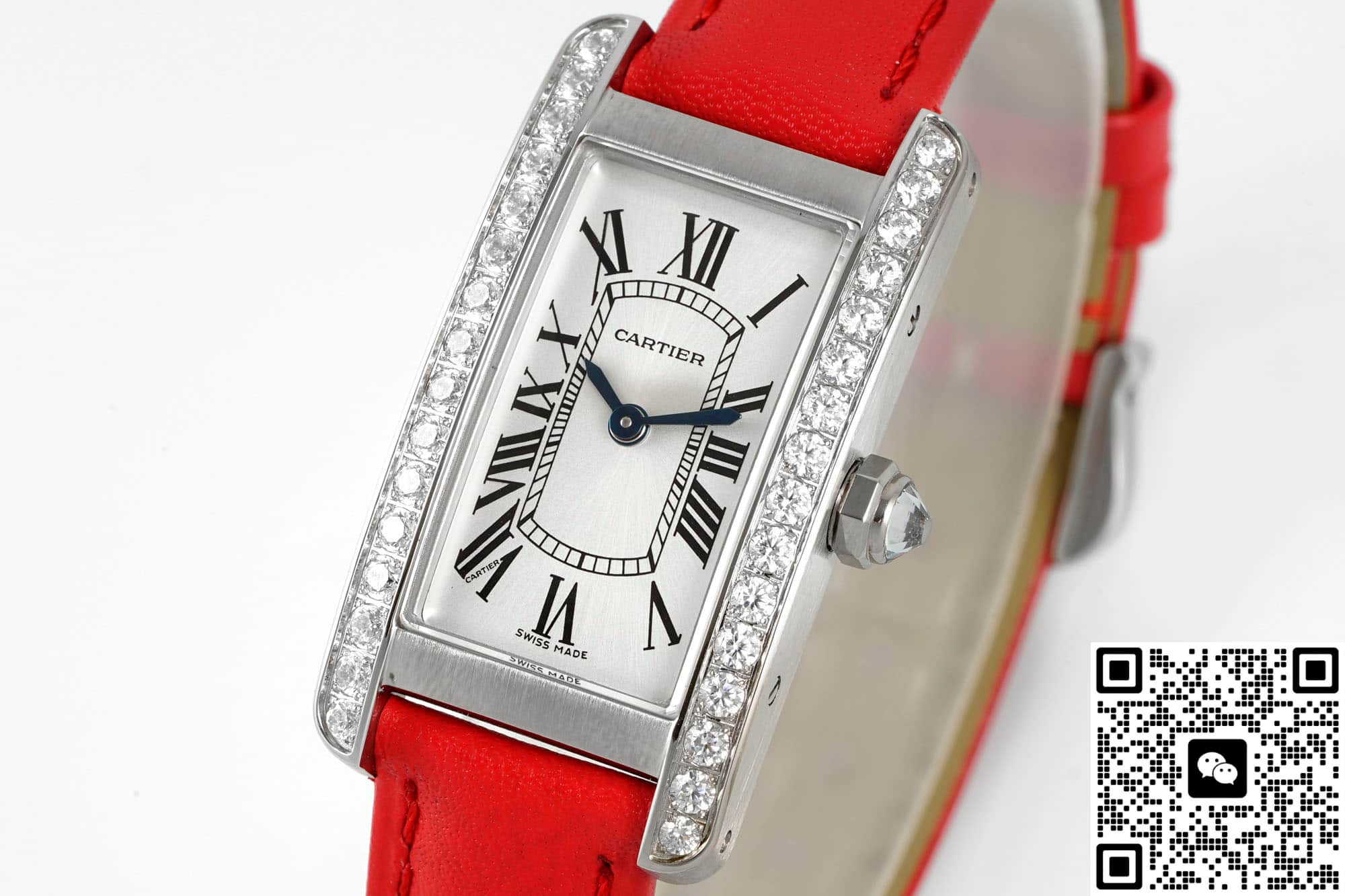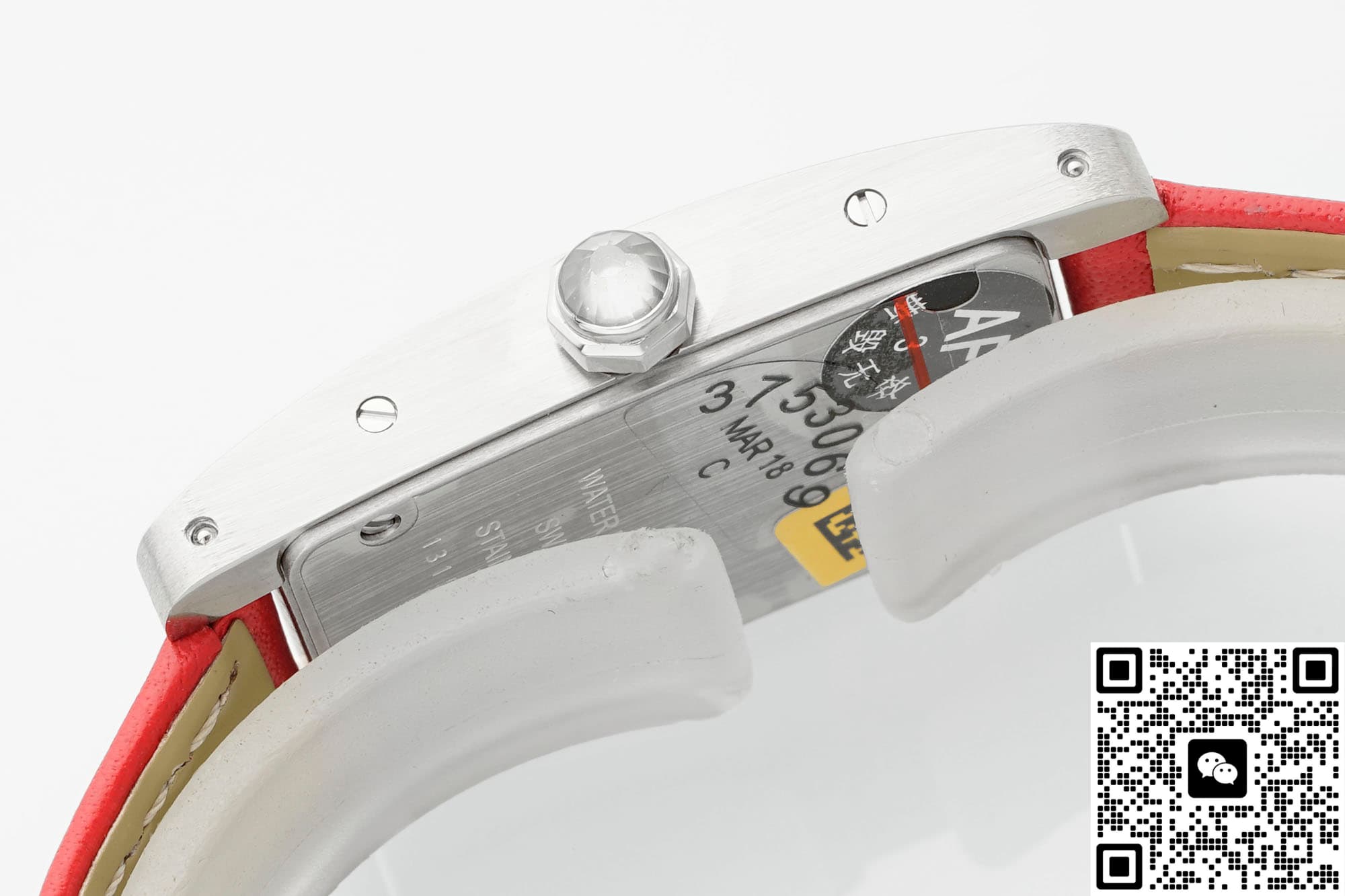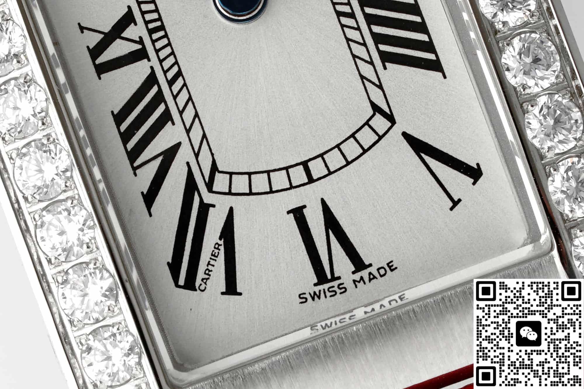 In order to restore the genuine version to the greatest extent possible, the AF factory has also made molds for the entire Cartier Tank replica watch. The size is also similar to the genuine product, 34*19MM, and the error is very small. It can be stuck to this extent, which is also very excellent. It also fits the wrist very well. In terms of size, when placed next to the genuine product, there is no difference to the naked eye. The case material is also a classic configuration, which is stainless steel. This material is very stable, not easily affected by the external environment, does not discolor or rust, and has high hardness. The technology and craftsmanship of AF Factory are also excellent. For this kind of square case, it is quite difficult to alternate between rounded corners and right angles. The edges of this tank watch case from AF factory have multiple polishing treatments. It feels fine and smooth to the touch, and the texture is basically the same as the genuine product. The metallic luster is also uniform when viewed under light. The bezel is also set with diamonds on both sides, which are water-cut diamonds. The cut surface is uniform and the fire effect is also good. To the naked eye, the effect is not much different from that of natural diamonds. The setting is also very firm, the four claws are very stable and the spacing is also very uniform. The spinel on the crown of the AF factory watch is not made into blue spinel on this model, but ordinary spinel. However, the AF factory also has this anti-counterfeiting technology.