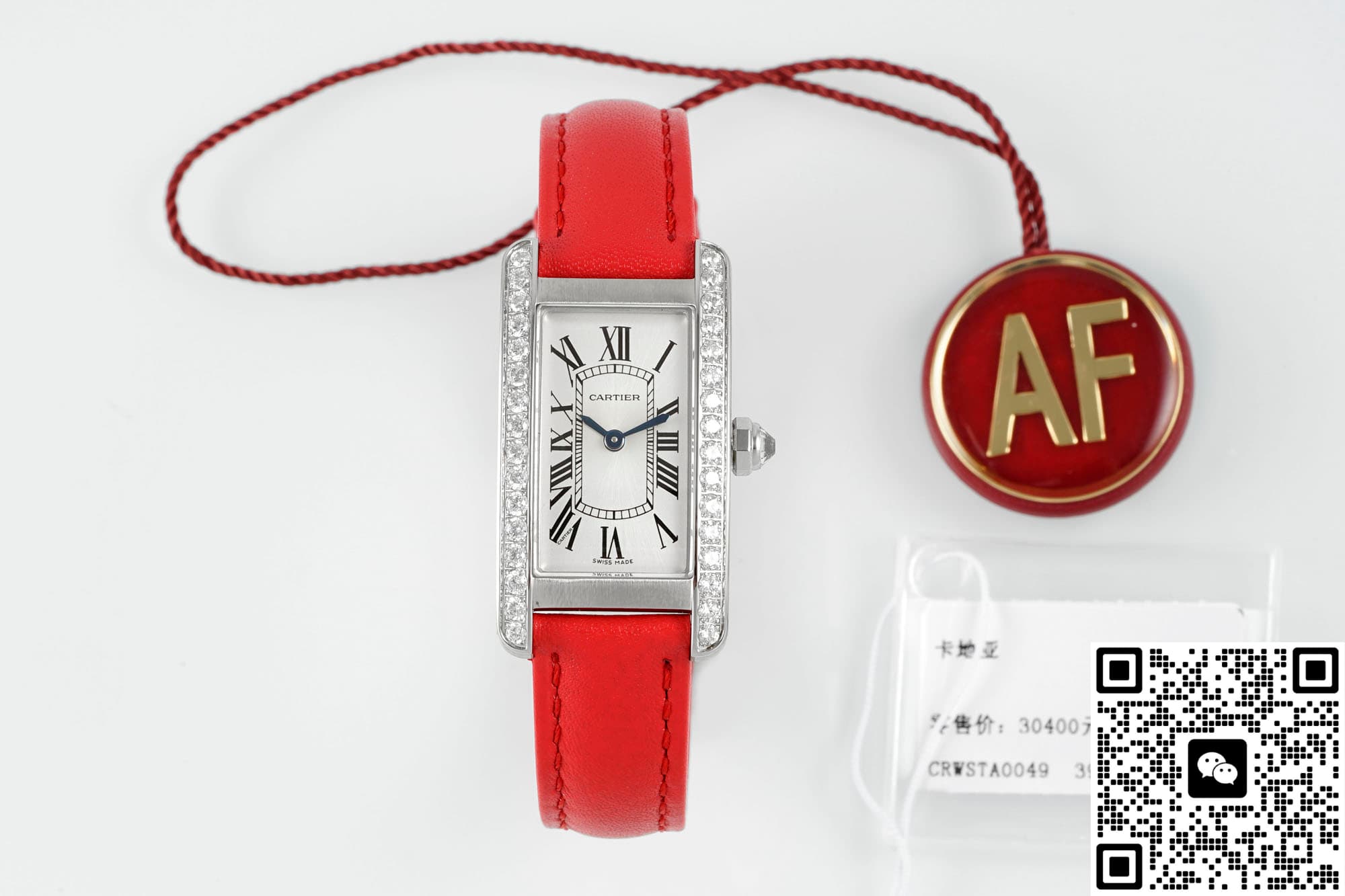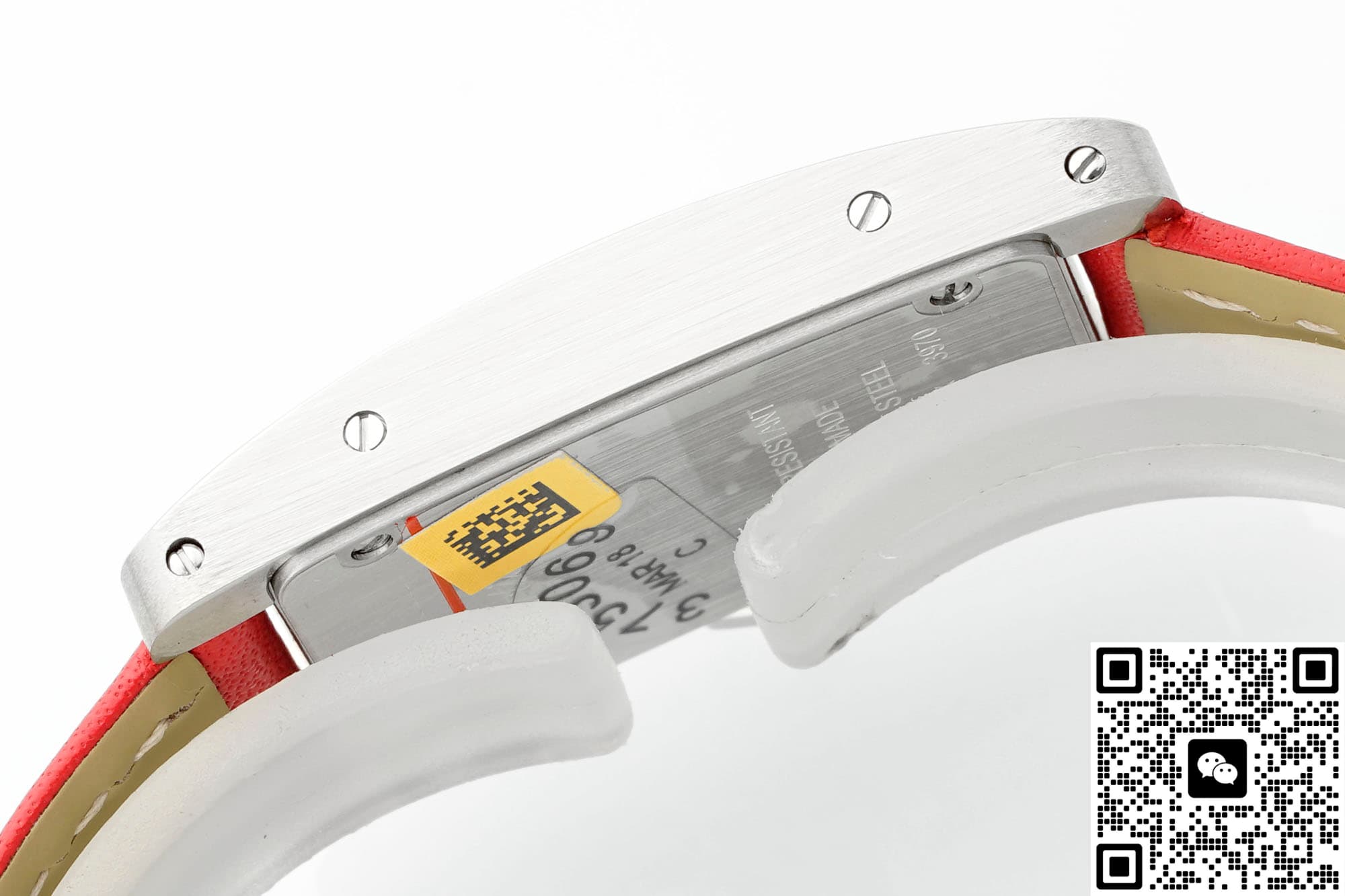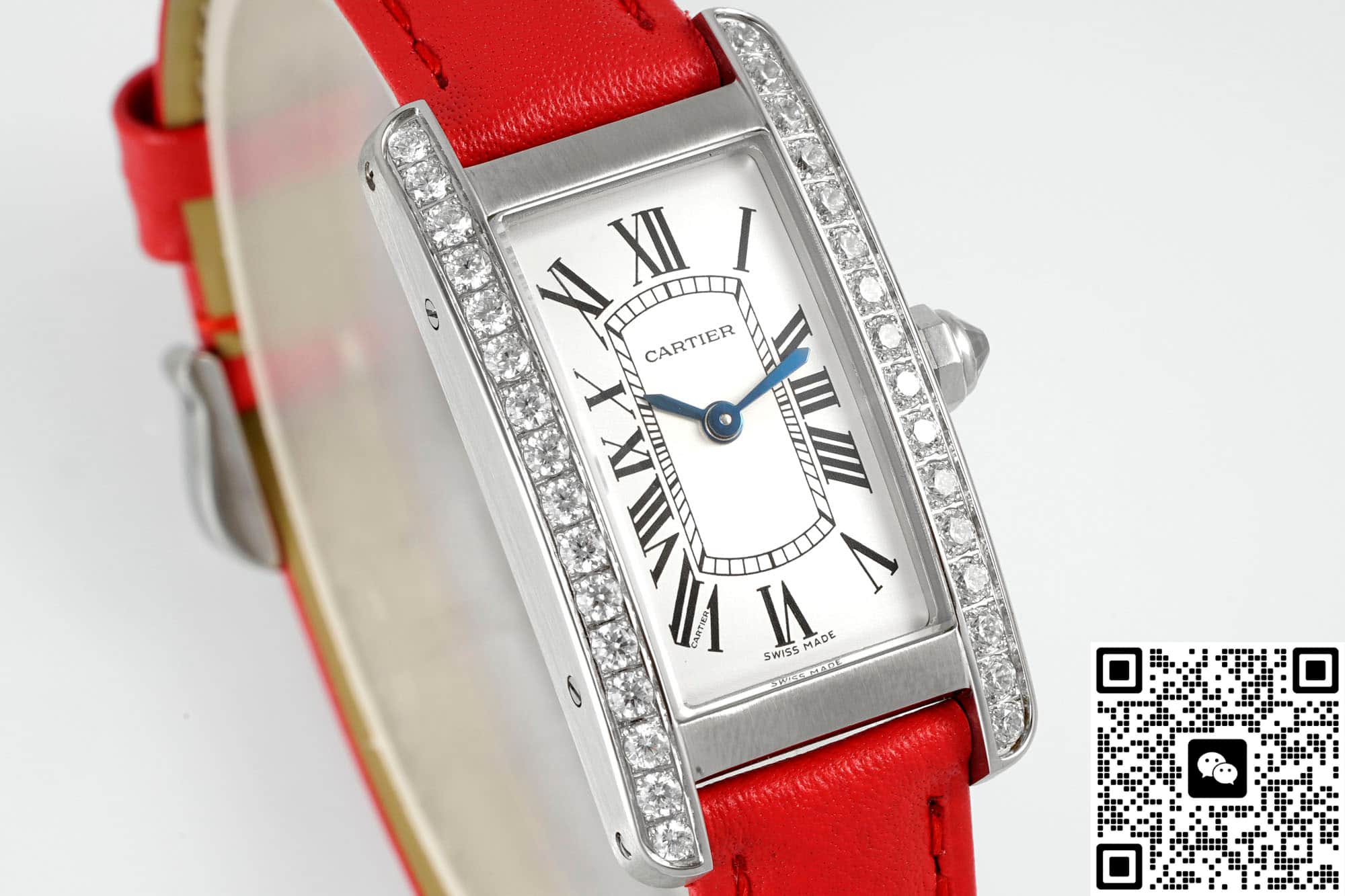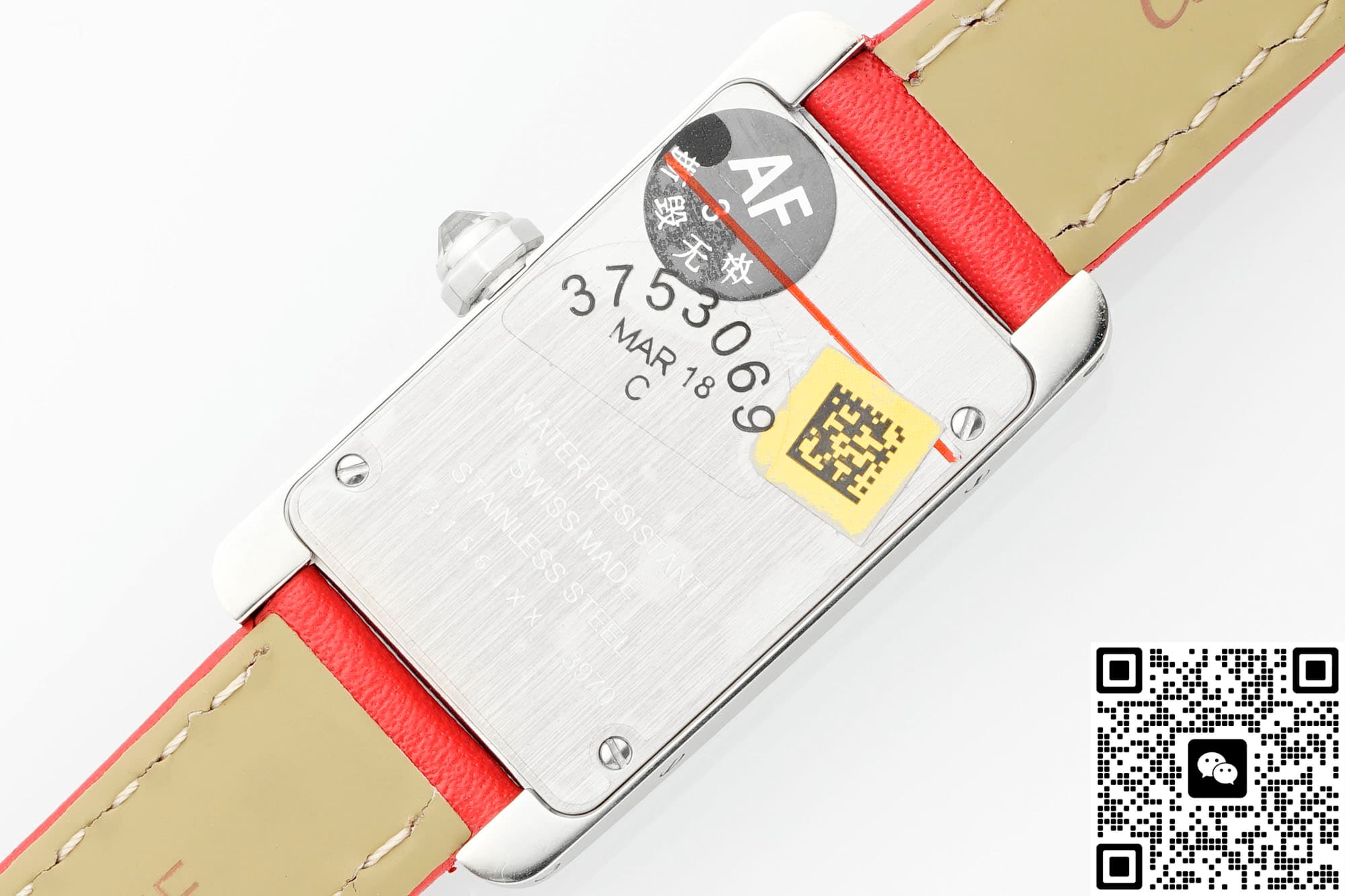 In order to restore the genuine version to the greatest extent possible, the AF factory has also made molds for the entire Cartier Tank replica watch. The size is also similar to the genuine product, 34*19MM, and the error is very small. It can be stuck to this extent, which is also very excellent. It also fits the wrist very well. In terms of size, when placed next to the genuine product, there is no difference to the naked eye. The case material is also a classic configuration, which is stainless steel. This material is very stable, not easily affected by the external environment, does not discolor or rust, and has high hardness. The technology and craftsmanship of AF Factory are also excellent. For this kind of square case, it is quite difficult to alternate between rounded corners and right angles. The edges of this tank watch case from AF factory have multiple polishing treatments. It feels fine and smooth to the touch, and the texture is basically the same as the genuine product. The metallic luster is also uniform when viewed under light. The bezel is also set with diamonds on both sides, which are water-cut diamonds. The cut surface is uniform and the fire effect is also good. To the naked eye, the effect is not much different from that of natural diamonds. The setting is also very firm, the four claws are very stable and the spacing is also very uniform. The spinel on the crown of the AF factory watch is not made into blue spinel on this model, but ordinary spinel. However, the AF factory also has this anti-counterfeiting technology.