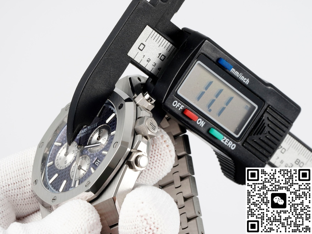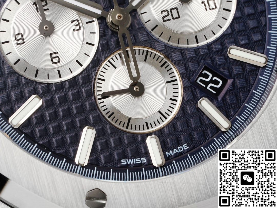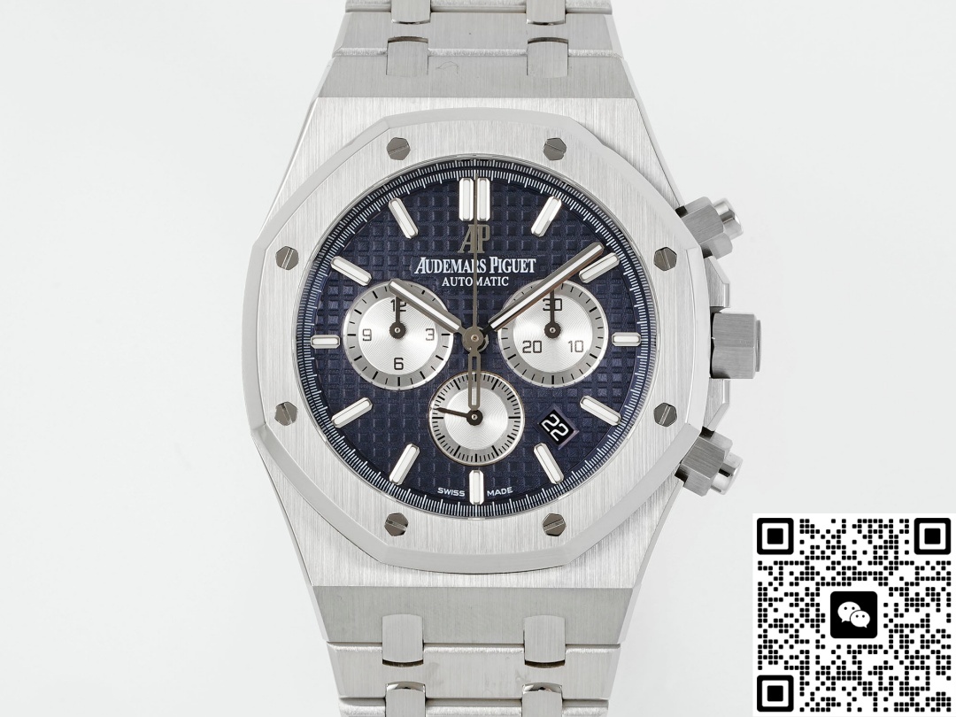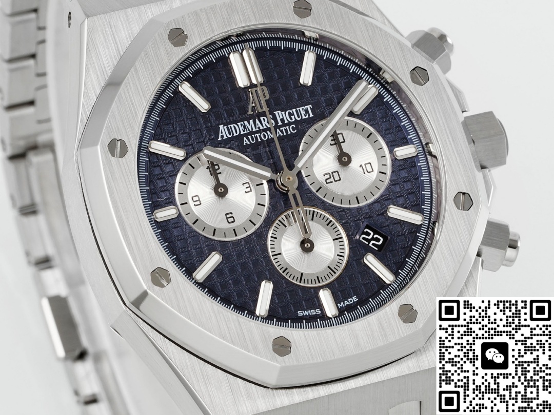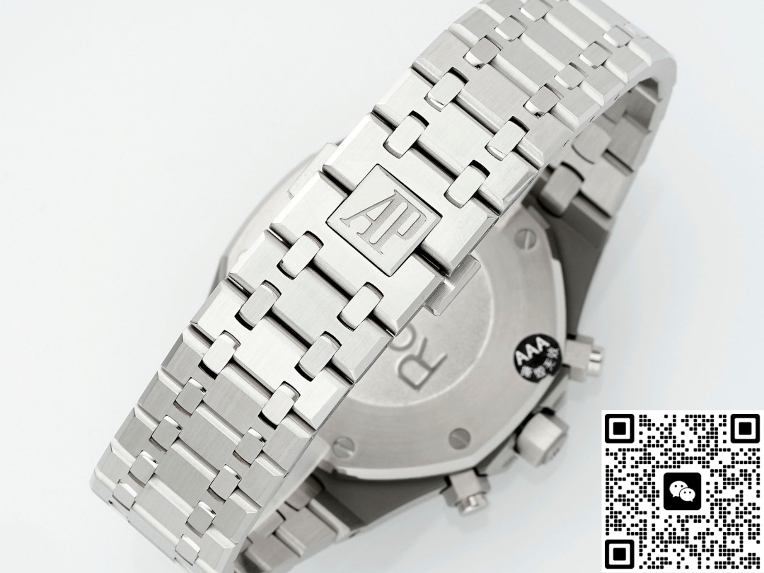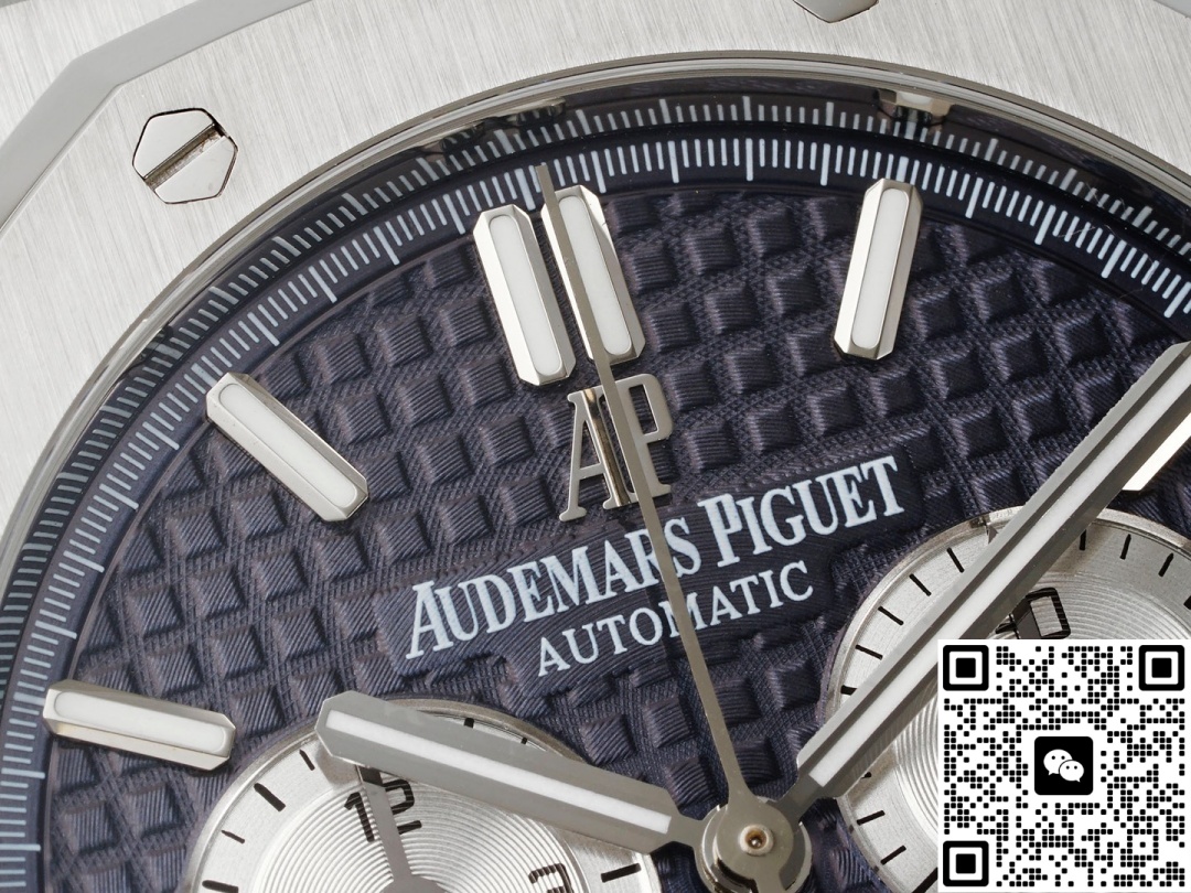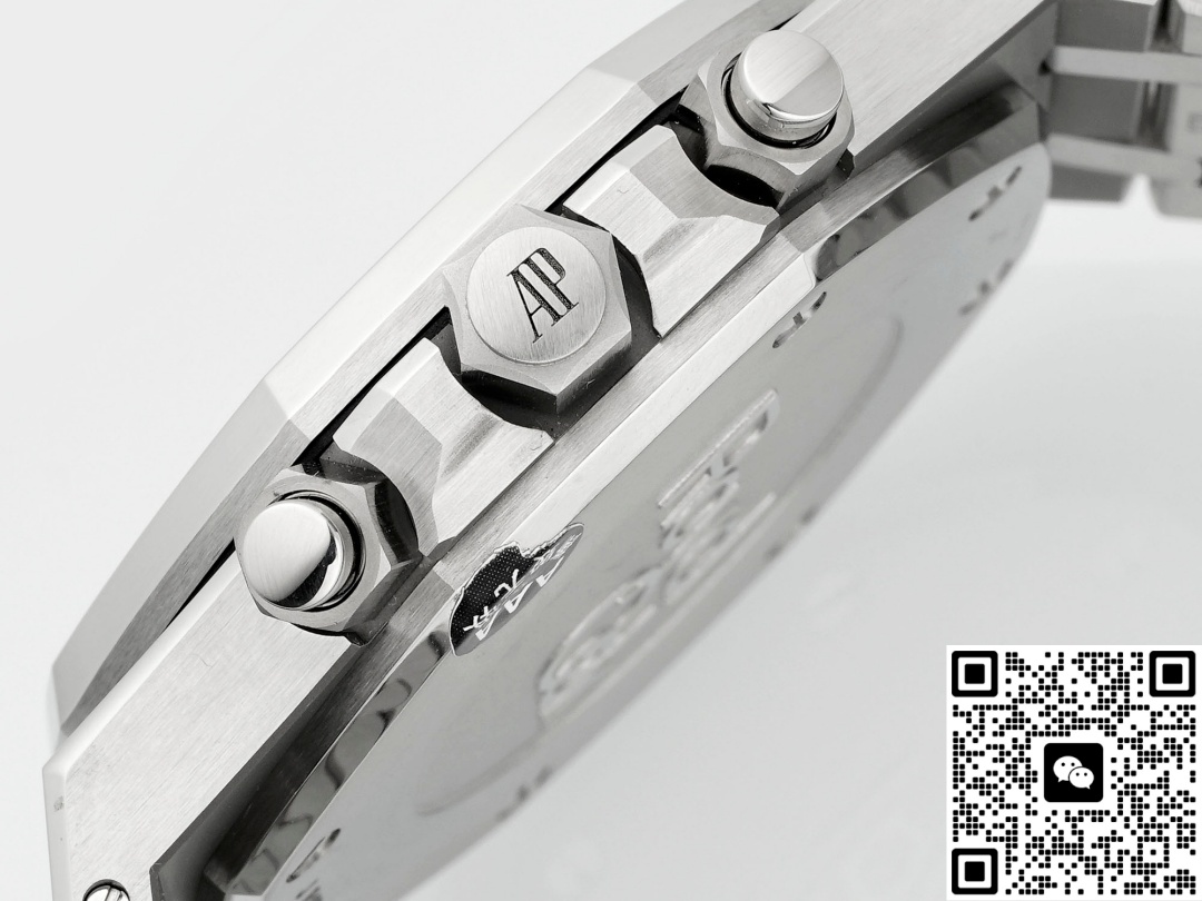 Today, we are reviewing the APW factory Audemars Piguet Royal Oak 26331ST.oo.1220ST.01 replica watch. Let’s first take a look at the appearance. This watch is different from the previous 7750 modified version. The spacing between the three sub-dials of this watch is the same, and its chronograph function can also be fully realized. The size of this watch is 41MM and its thickness is 11MM. These figures are the same as the genuine product, which to a large extent demonstrates the technological progress of APW Factory. The precise control of data makes this watch look more harmonious in appearance and more comfortable to wear. When we look at the dial again, this three-eye six-hand design, the vortex texture on the sub-dial is also very detailed. This includes its checkered dial, the large checkered dial, which is a very sharp texture, a very fine texture, with that kind of fine radiating texture. This texture is not very obvious when viewed from strong light, but it can be seen when the Angle is changed. It’s extremely beautiful. The dial texture and reflective texture of APW factory watches are done very well. When we look at the dial adjustment, there is a chronograph minute dial at three o ‘clock, a chronograph hour dial at nine o ‘clock, and an independent small seconds hand design at six o ‘clock. The longest and thinnest hand on the dial is its chronograph second hand. We need to turn it on to make it move. Many watch enthusiasts are puzzled when they get it, wondering why their second hand doesn’t move. In fact, this longest second hand is only used when timing. Its central axis is designed in the shape of a hat. The large seconds hand features a relatively good solid central axis design. As for the central axes of the three chronographs, I personally think they are a bit more hollowed-out. There is a date display window at the 4 to 5 o ‘clock position on the dial, and the font printing is also very clear. Looking at the bezel again, it features an octagonal design, which is very classic. The screws from the APW factory have a slight downward sinking treatment, consistent with the genuine product. The material is stainless steel and has undergone a brushed finish, presenting a very fine texture. This is the texture that a high-end wristwatch should have.