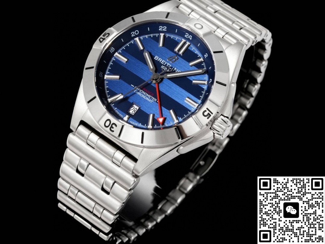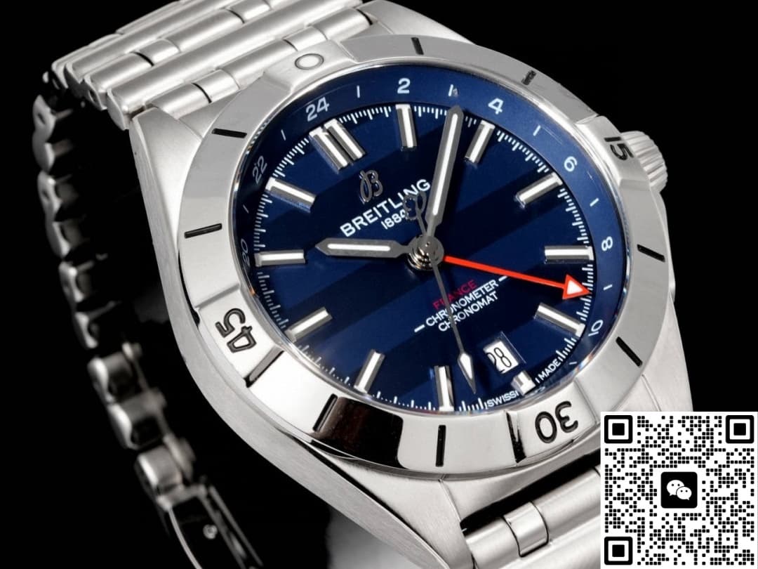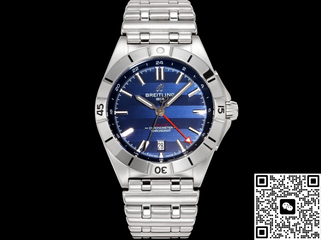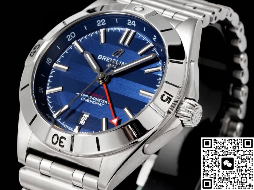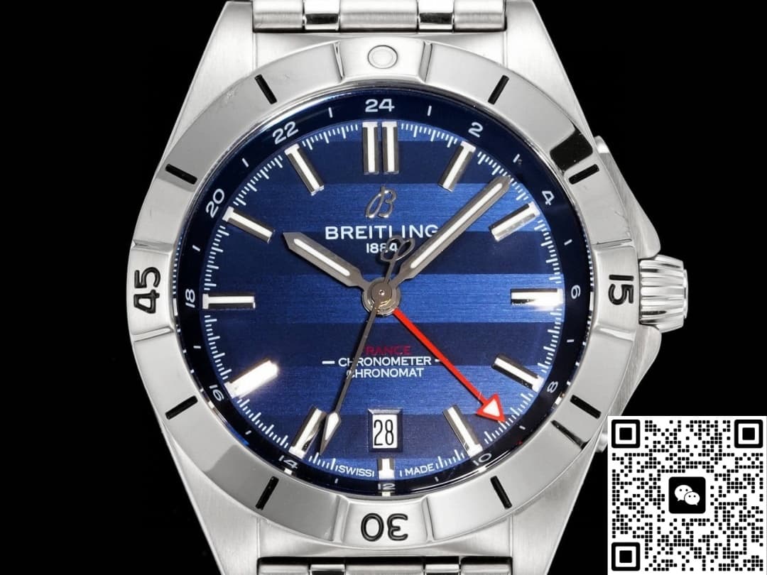 This Breitling watch features a date display and dual time zone function. There is a calendar window at the 6 o’clock position on the dial. The white background with black numerals creates a strong contrast, making it very easy and clear to read the time. This function is highly practical and frequently used in daily life. The dual time zone function of the watch should be used in conjunction with the red GMT hand and the 24-hour scale. This feature is particularly suitable for people who travel or commute frequently. Moreover, adjusting the time on this watch is very convenient. The crown has two settings: in the first setting, turning it clockwise adjusts the GMT hand, and turning it counterclockwise quickly adjusts the date. In the second setting, the seconds stop, allowing for precise adjustment of the main time zone.