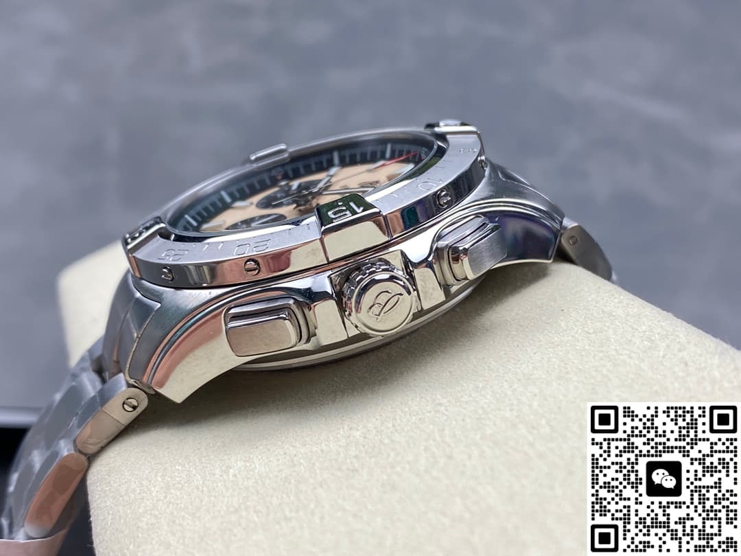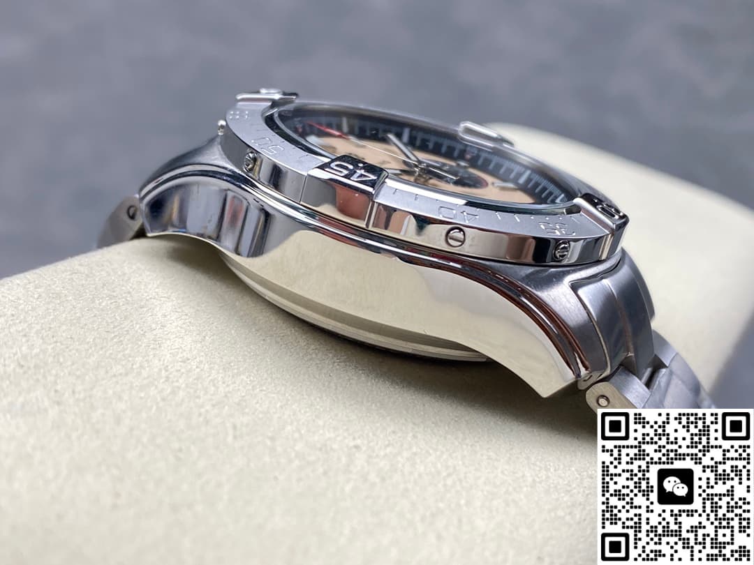The BLS Factory Breitling Avenger AB0147101A1A replica watch has the same size as the original version, but there might be a slight difference in thickness. Due to the adjustment of the movement structure, it might be slightly thicker, but it won’t be too obvious and won’t look bulky. The color difference of the beige dial is not significant. The control of the dial color by BLS Factory is still acceptable. It won’t be too yellow or too white, and it forms a contrast with the black sub-dial, which is very clear. Reading the time and timing are very clear. The three small dials correspond to the seconds, minutes, and hours timing functions. The CD pattern and race track pattern on the dial are very clear and three-dimensional, and the texture direction and density are very close to the original version. The details are also well done. The hour markers are a combination of metal bar nails and luminous material, and the luminous effect is good. There are no small black dots or bubbles as flaws. The luminous material is fluorescent green, and the luminous duration is also quite long, which is completely sufficient. The pointers have been polished, and they are very smooth and sharp. The date display at the six o’clock position has the same size and shape of the window as the original version. The size of the calendar, the font thickness, are reasonable, and the packaging is beautiful. It operates smoothly and has the same operation logic as the original product, which is very convenient. The back of the watch is a transparent design, allowing you to clearly see the details of the movement. The sealing performance is also very good. It is not afraid of water contact in daily life, and it has good waterproof performance. This is a replica watch that is very clear and convenient to use.