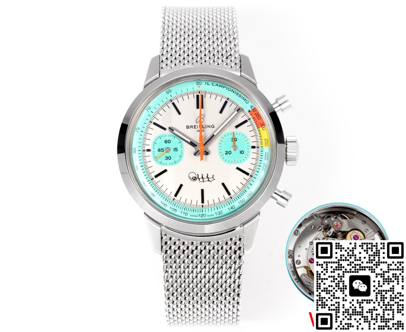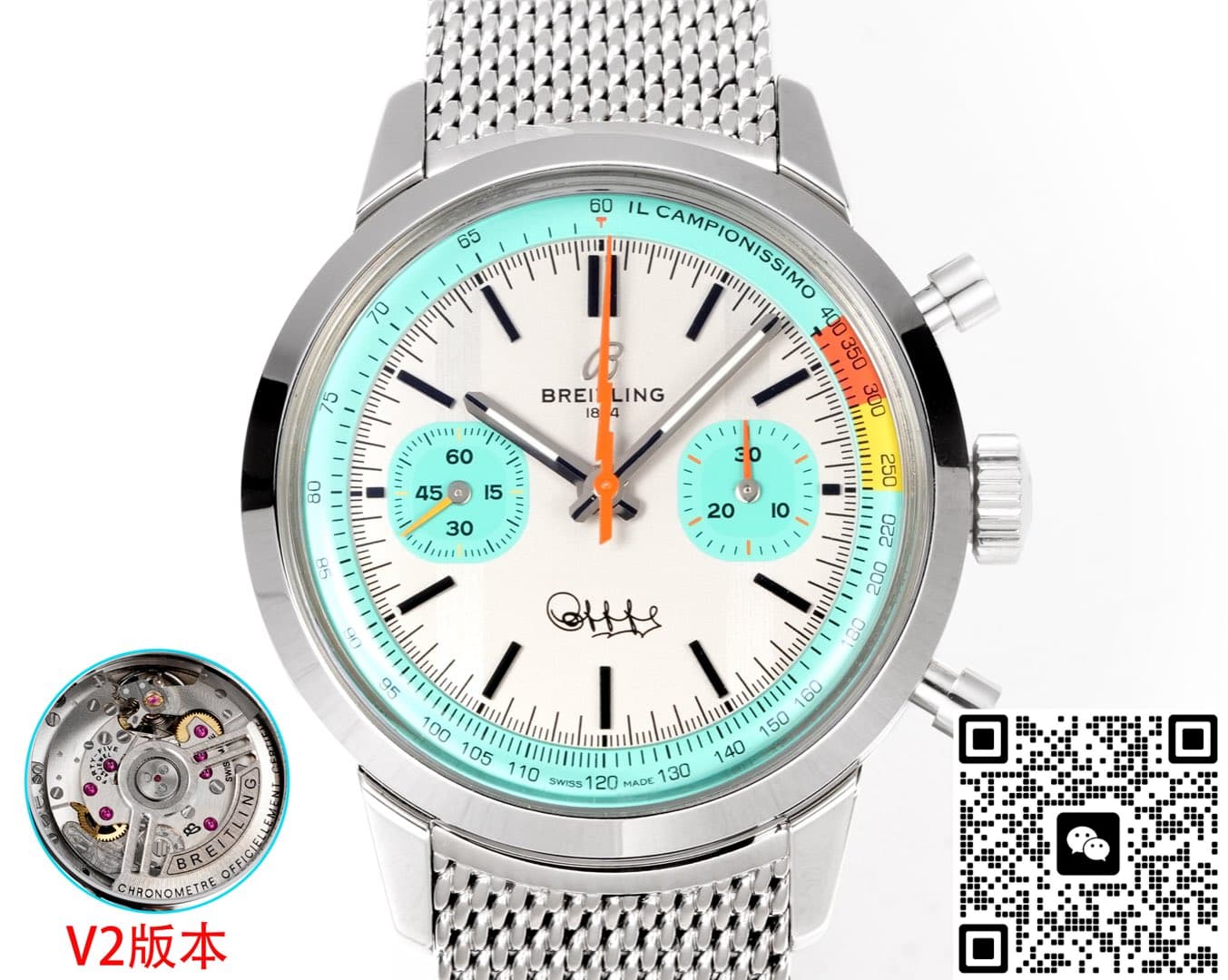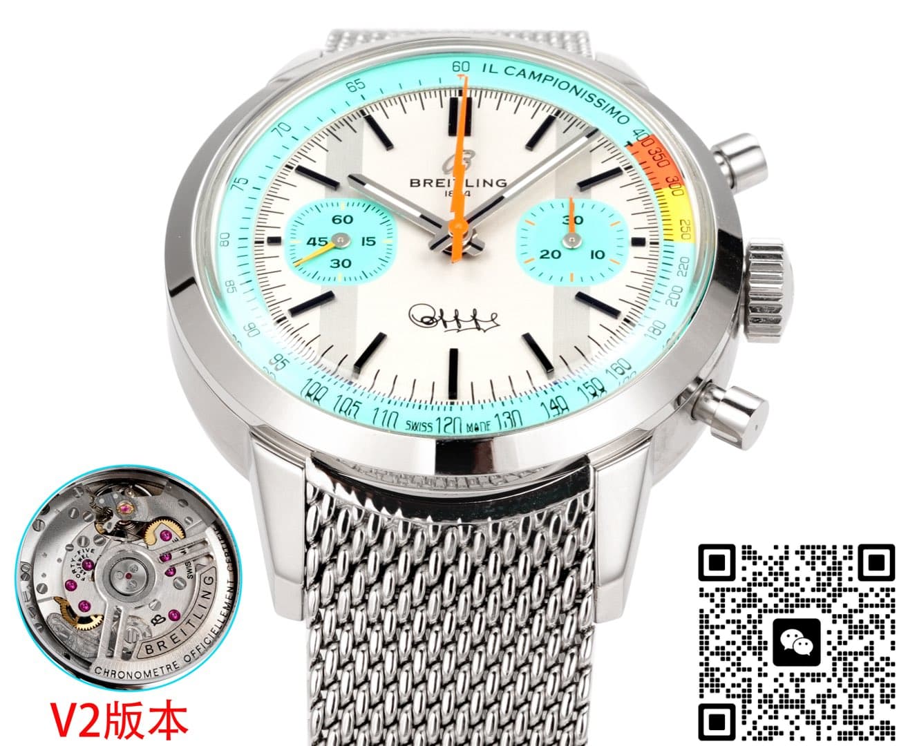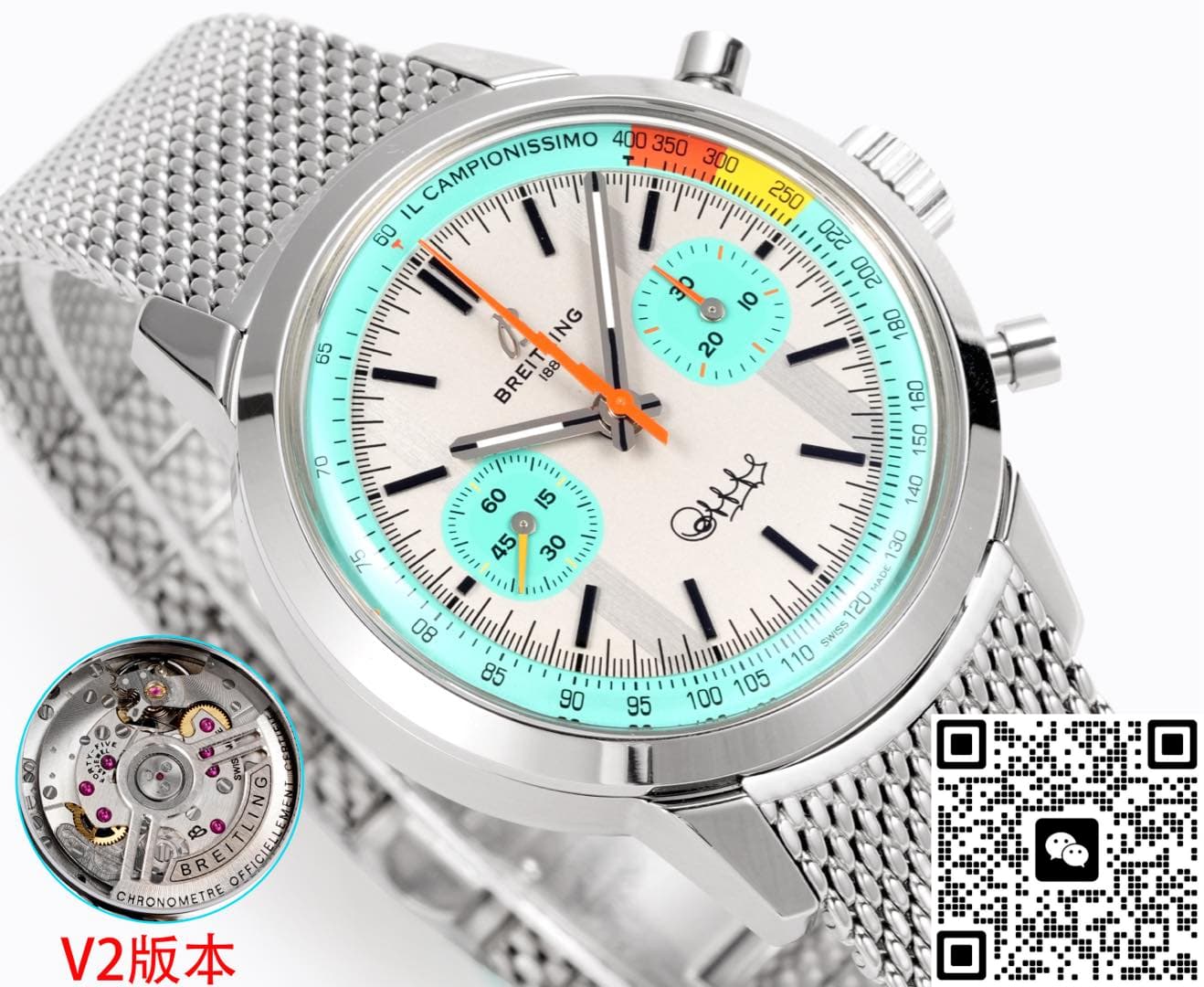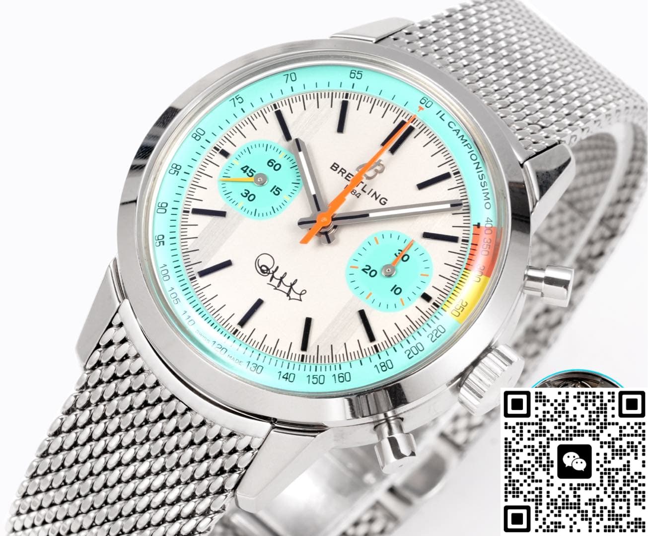 The Breitling TOP TIME AB01768A1A1A1 is a stainless steel watch. Apart from the dial, the rest of the watch is made of steel, so it has that common metallic silver color, giving a serious and cool feel. The base color of the dial is white, with a green scale ring and two green sub-dials for the chronograph. There’s also a small section of orange and red on the scale ring, and the chronograph hand is orange too. All these colors together make the watch look very sporty and full of energy. I think the color matching of a replica watch shouldn’t be overlooked—a harmonious color scheme can really lift your mood.