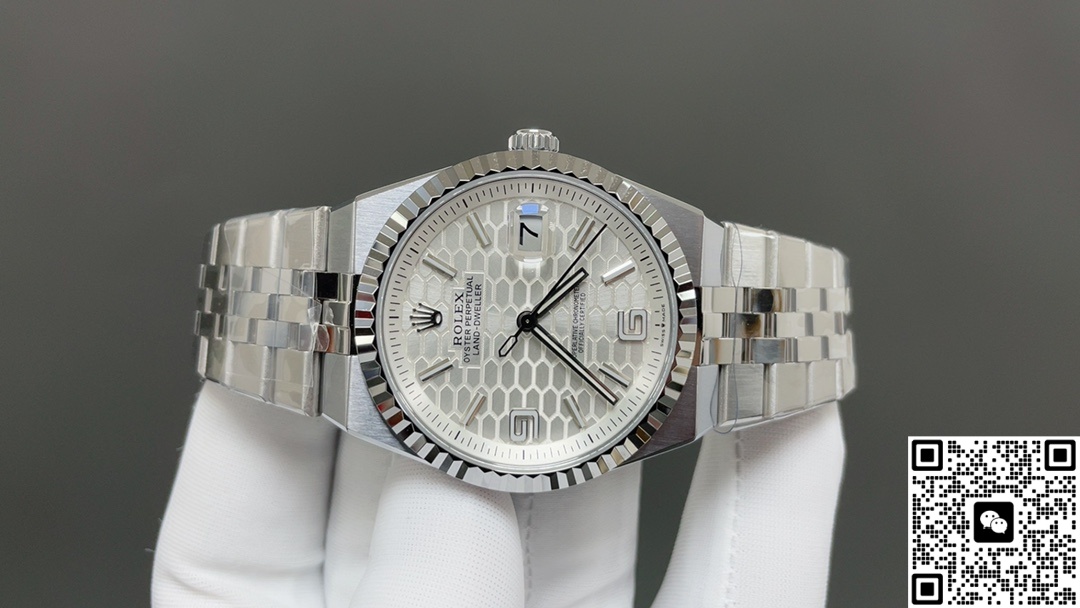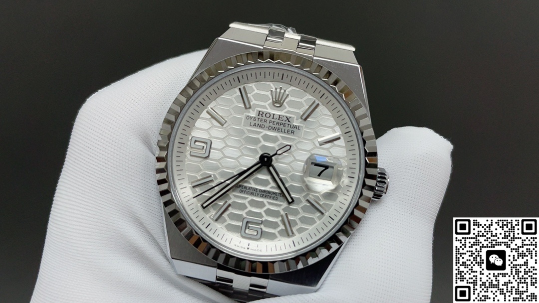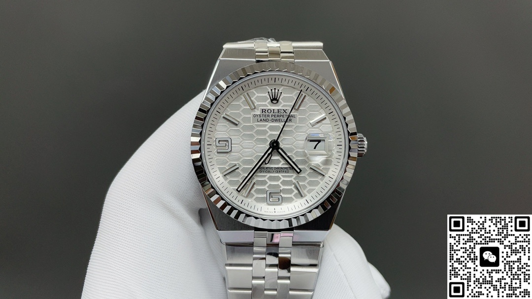 The ES Factory Rolex Land-Dweller M127334-0001 1:1 best version replica watch, with its exquisite craftsmanship and innovative design, is also a new model of Rolex this year. The 40mm diameter of the watch is neither too big nor too small, just right. It not only retains sufficient visual presence but also ensures wearing comfort. The case is crafted from high-quality 904L stainless steel. After polishing, its luster appears rich in layers. When it comes to this replica watch, it is necessary to mention the craftsmanship of the dial. The white dial has a honeycomb texture, making this watch instantly extraordinary. ES Factory uses advanced femtosecond laser technology to precisely cut out three-dimensional honeycomb patterns on the dial. Each honeycomb grid is uniform and consistent, and presents a delicate sunray effect under different light conditions. Those who like this effect can consider it. In terms of the core movement, this replica watch is equipped with the 7135 automatic mechanical movement independently developed by ES factory, whose accuracy and stability are by no means lagging behind. Through the sapphire crystal glass, you can fully appreciate the craftsmanship and texture on the dial, including the unique honeycomb texture and three-dimensional hour markers. The transparent caseback design allows the wearer to directly appreciate the precise operation of the movement, including the skeletonized rotor and the exquisitely decorated plates. This design fully demonstrates ES Factory’s confidence in the quality of this replica watch.
