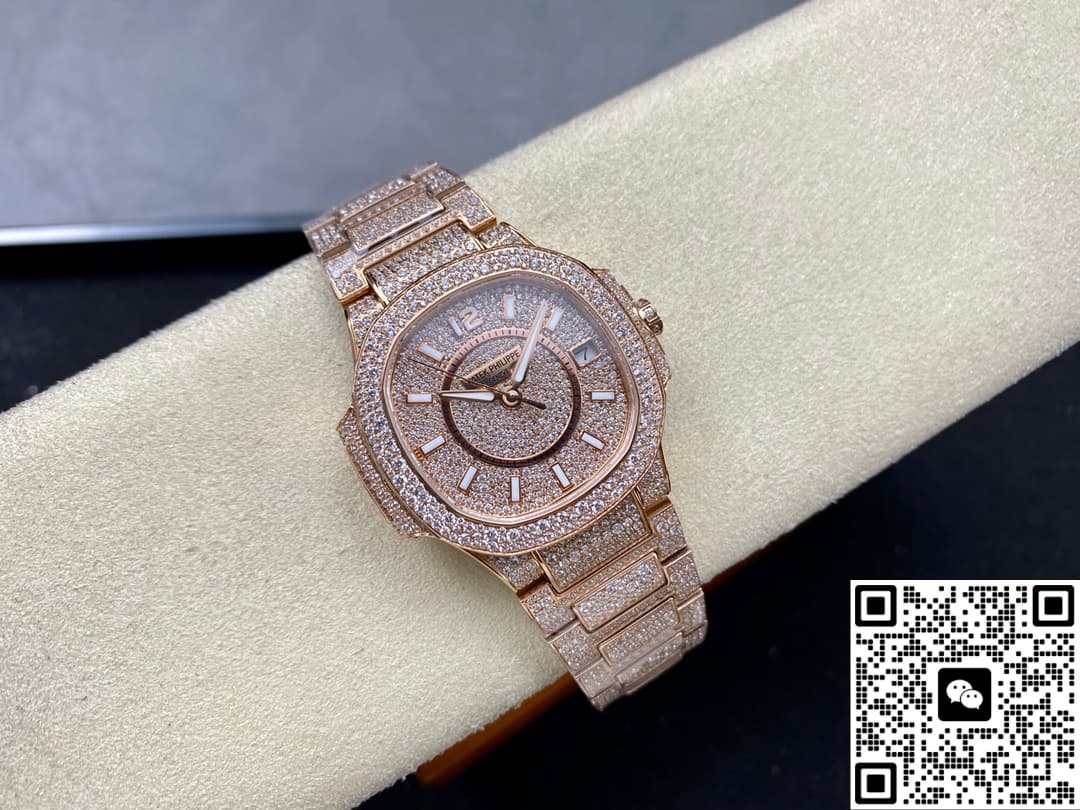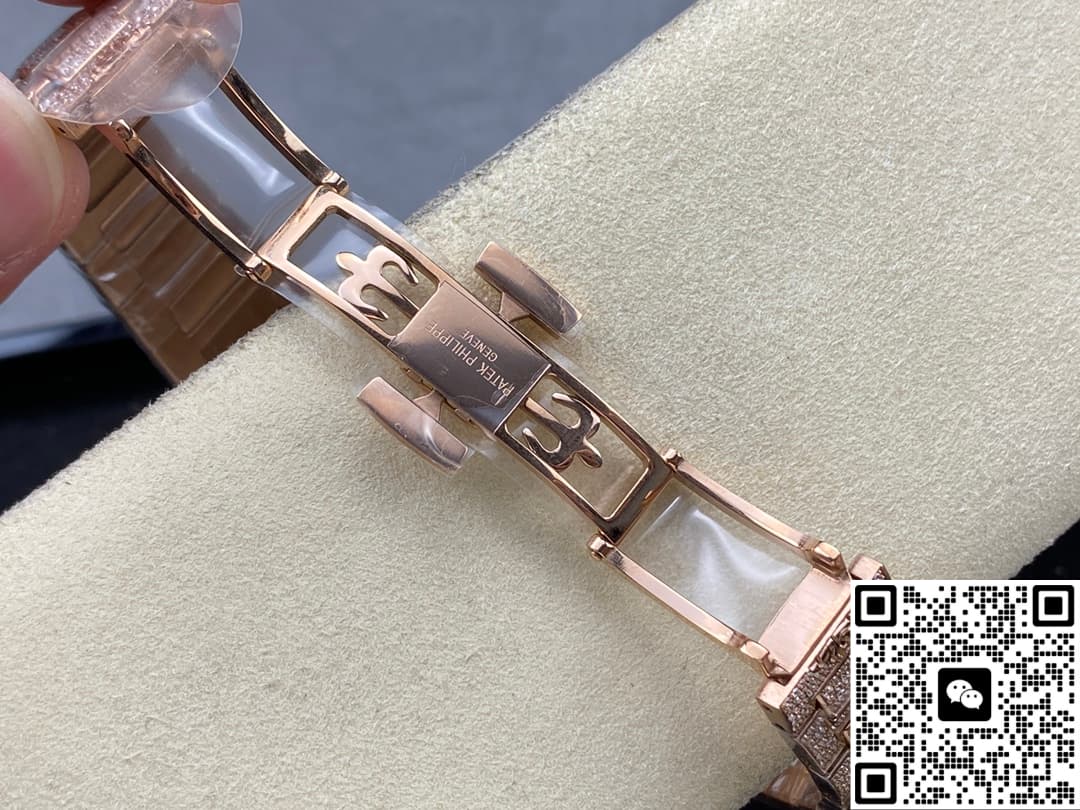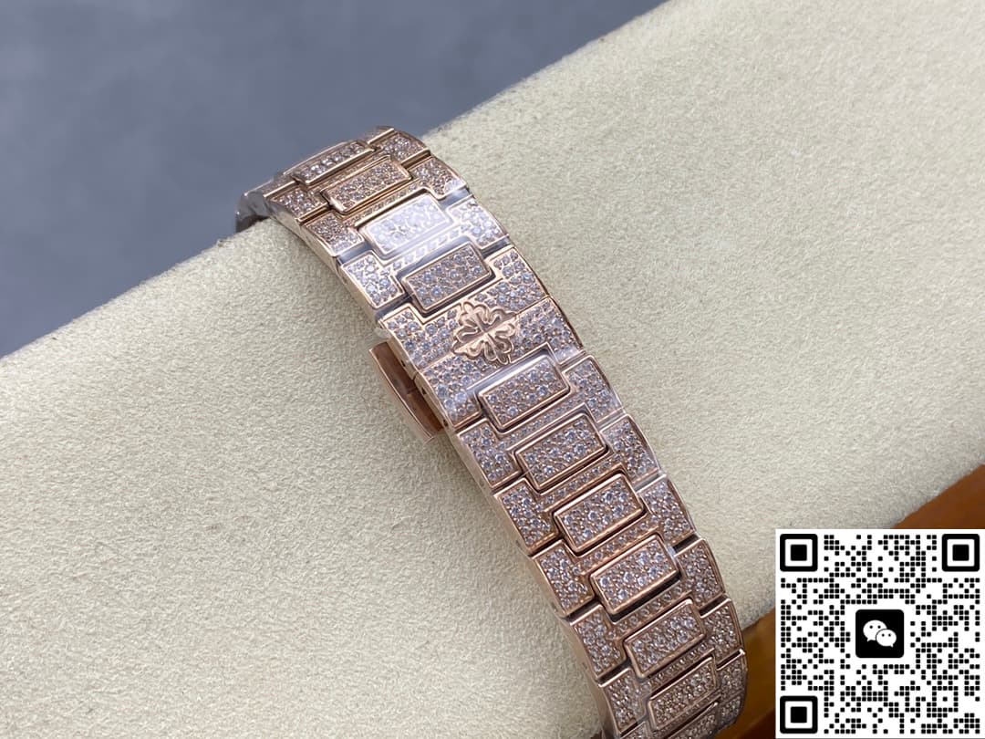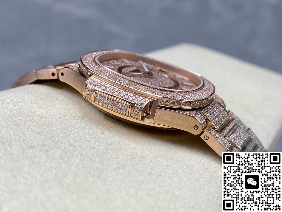 The watch I’m looking at today measures 33.6MM, which is very suitable for girls to wear. It is small and exquisite. Moreover, the thickness of this watch is controlled at around 8.7mm, consistent with the genuine product. Visually, it gives a sense of lightness and thinness, and it is also more comfortable to wear. The first thing that catches the eye is all diamonds. The dial is full of diamonds, and so is the strap. It is set with irregular snowflake diamonds. There are approximately 2,328 diamonds on the entire watch, which is the most eye-catching part. The diamonds are neatly arranged on the square dial, complementing the rose gold background color and exuding luxury. The bezel is designed in a smooth octagonal shape, which does not give the impression of being sharp. Wearing it makes the person look rather gentle and elegant. Through the classic sapphire crystal, you can see a date display window at the three o ‘clock position. The hour markers are white square hour markers. The case back is a transparent case back with the logo of Patek Philippe engraved on it. The gemstones on the case and the gold metal accessories, when combined, create a more layered effect. The texture on the back of the watch is also very neat. People with obsessive-compulsive disorder are in for a treat. The craftsmanship and technology of GR factory are quite good. Both the front and back can serve as an ornamental function. This is a very luxurious ladies’ wristwatch. That is GR factory Patek Philippe Nautilus 7021-1R-001 replica watch. Compared with the genuine product, its degree of restoration is also very high. It is a highly restored replica watch.