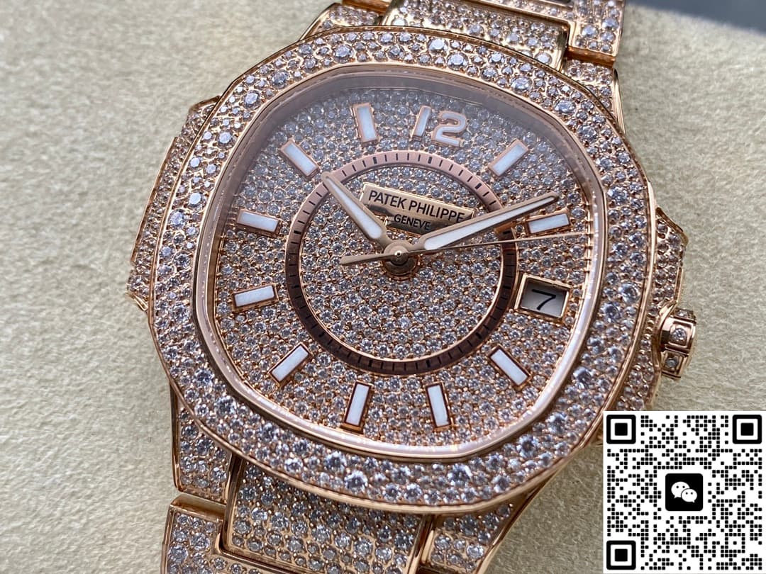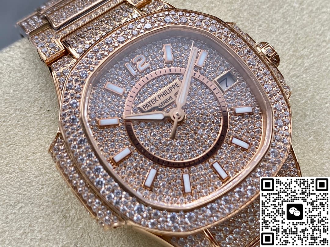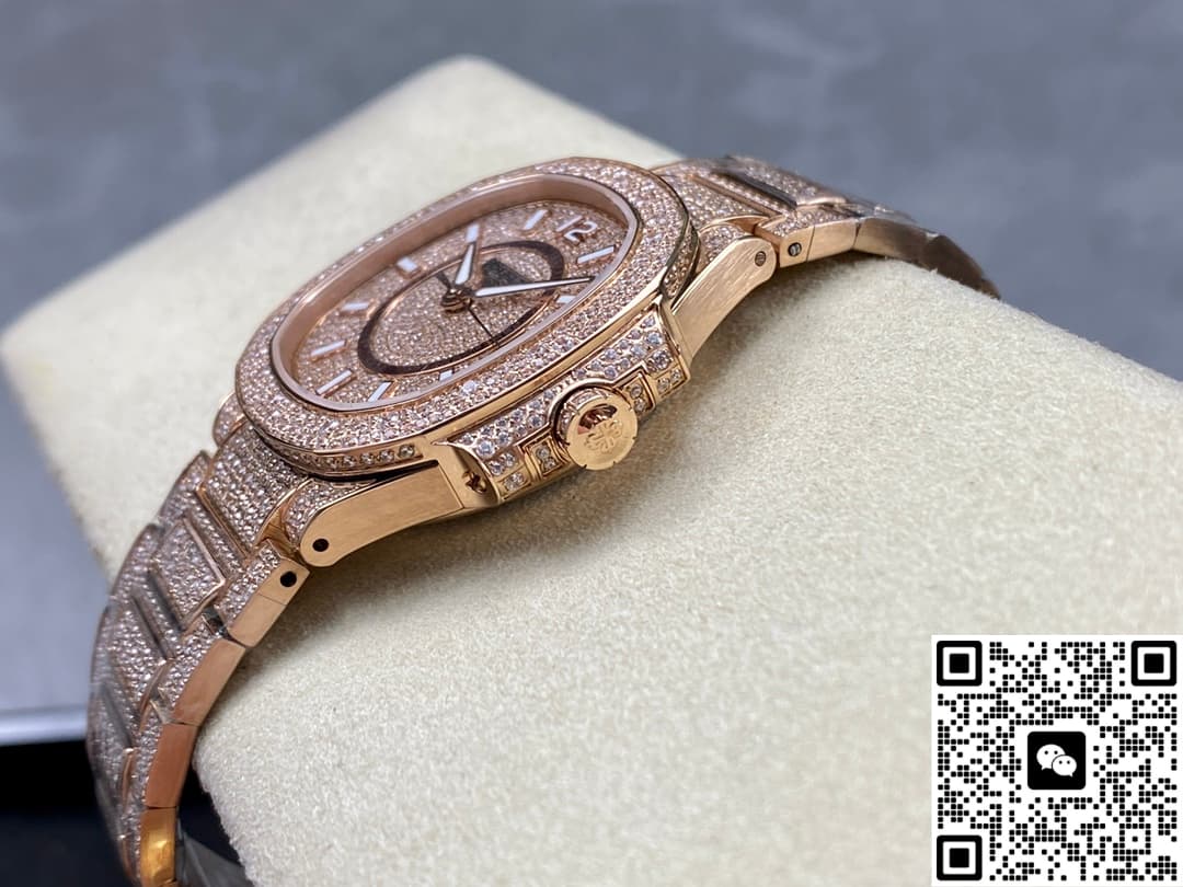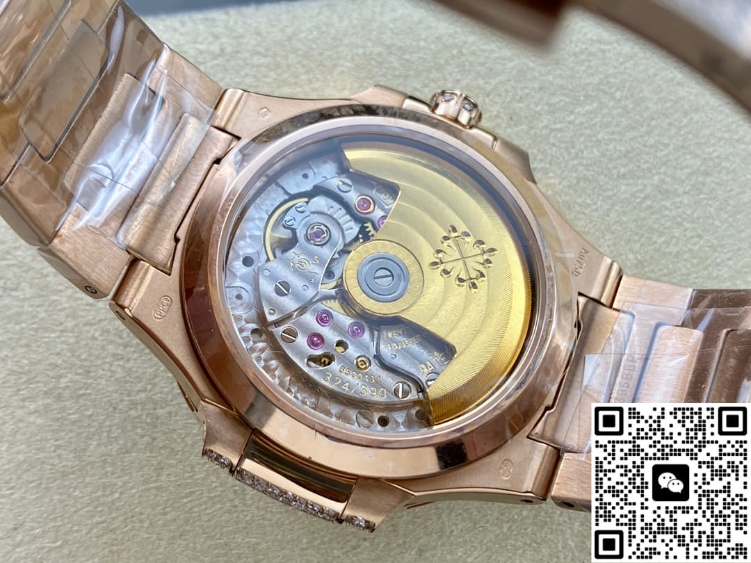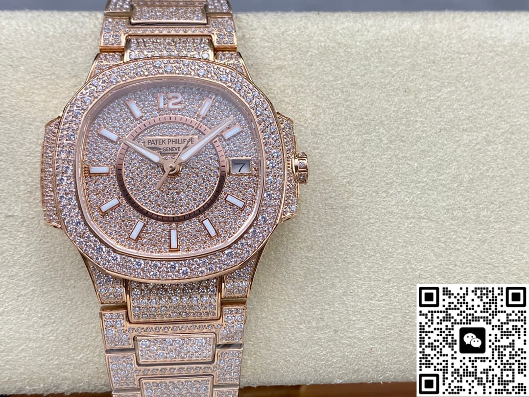 The watch I’m looking at today measures 33.6MM, which is very suitable for girls to wear. It is small and exquisite. Moreover, the thickness of this watch is controlled at around 8.7mm, consistent with the genuine product. Visually, it gives a sense of lightness and thinness, and it is also more comfortable to wear. The first thing that catches the eye is all diamonds. The dial is full of diamonds, and so is the strap. It is set with irregular snowflake diamonds. There are approximately 2,328 diamonds on the entire watch, which is the most eye-catching part. The diamonds are neatly arranged on the square dial, complementing the rose gold background color and exuding luxury. The bezel is designed in a smooth octagonal shape, which does not give the impression of being sharp. Wearing it makes the person look rather gentle and elegant. Through the classic sapphire crystal, you can see a date display window at the three o ‘clock position. The hour markers are white square hour markers. The case back is a transparent case back with the logo of Patek Philippe engraved on it. The gemstones on the case and the gold metal accessories, when combined, create a more layered effect. The texture on the back of the watch is also very neat. People with obsessive-compulsive disorder are in for a treat. The craftsmanship and technology of GR factory are quite good. Both the front and back can serve as an ornamental function. This is a very luxurious ladies’ wristwatch. That is GR factory Patek Philippe Nautilus 7021-1R-001 replica watch. Compared with the genuine product, its degree of restoration is also very high. It is a highly restored replica watch.