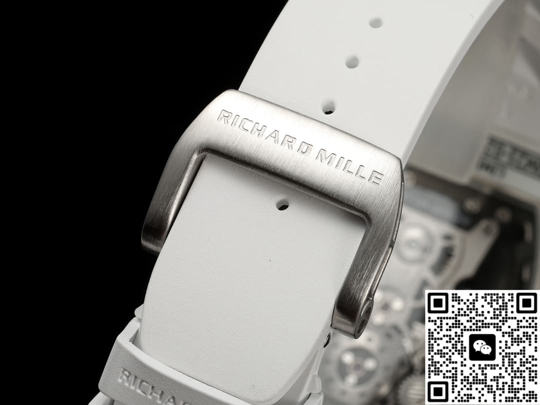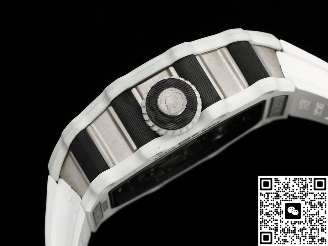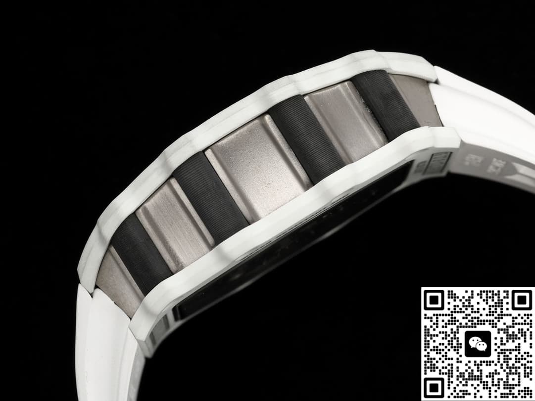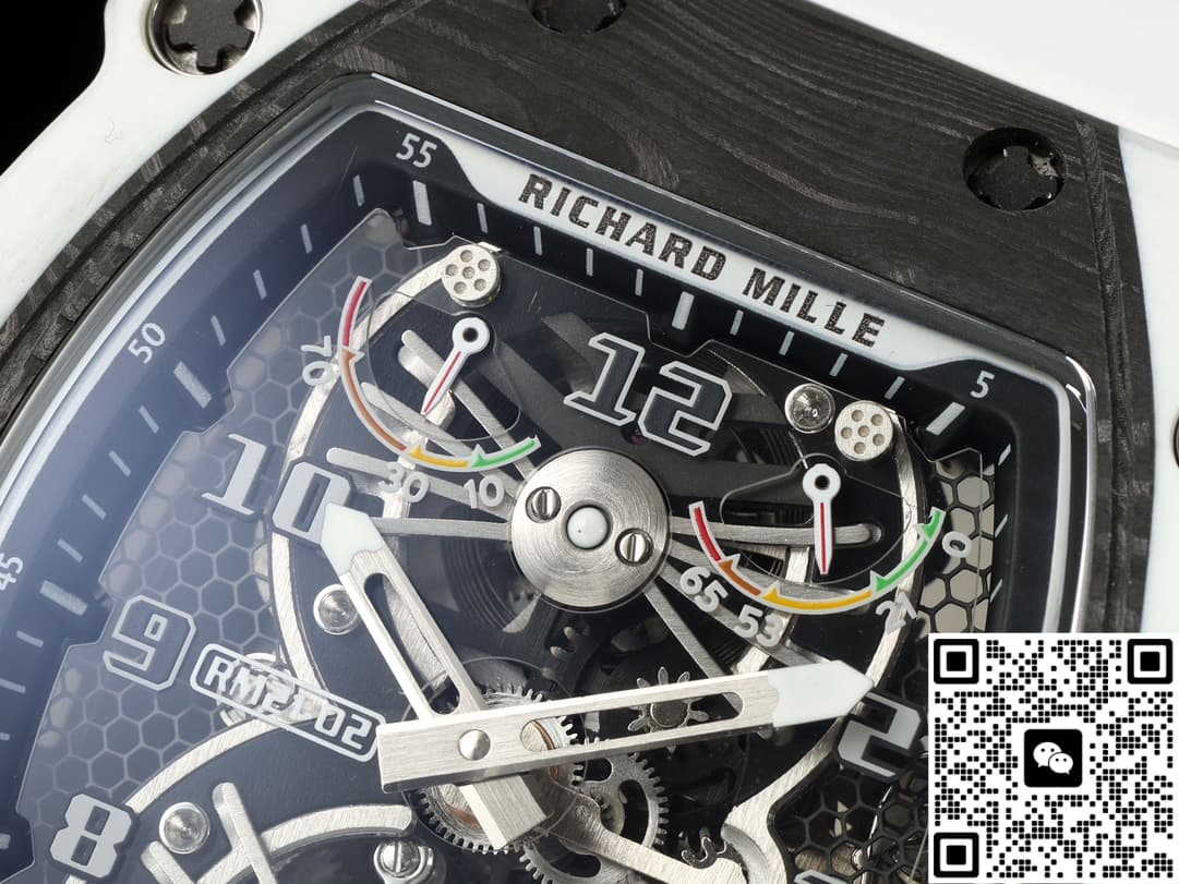 This replica watch adopts the iconic barrel dial design. The size of 42*50mm not only retains Richard Mill’s unique visual impact, but his back is curved, not flat, so it is more comfortable to wear. The watch case is made of QUARTZ TPT+CARBON TPT+ titanium alloy, which not only makes the watch lighter, but also increases its durability. The bezel is made of Carbon TPT carbon fiber and green Quartz TPT quartz fiber, forming a unique texture effect, and each one is unique.
