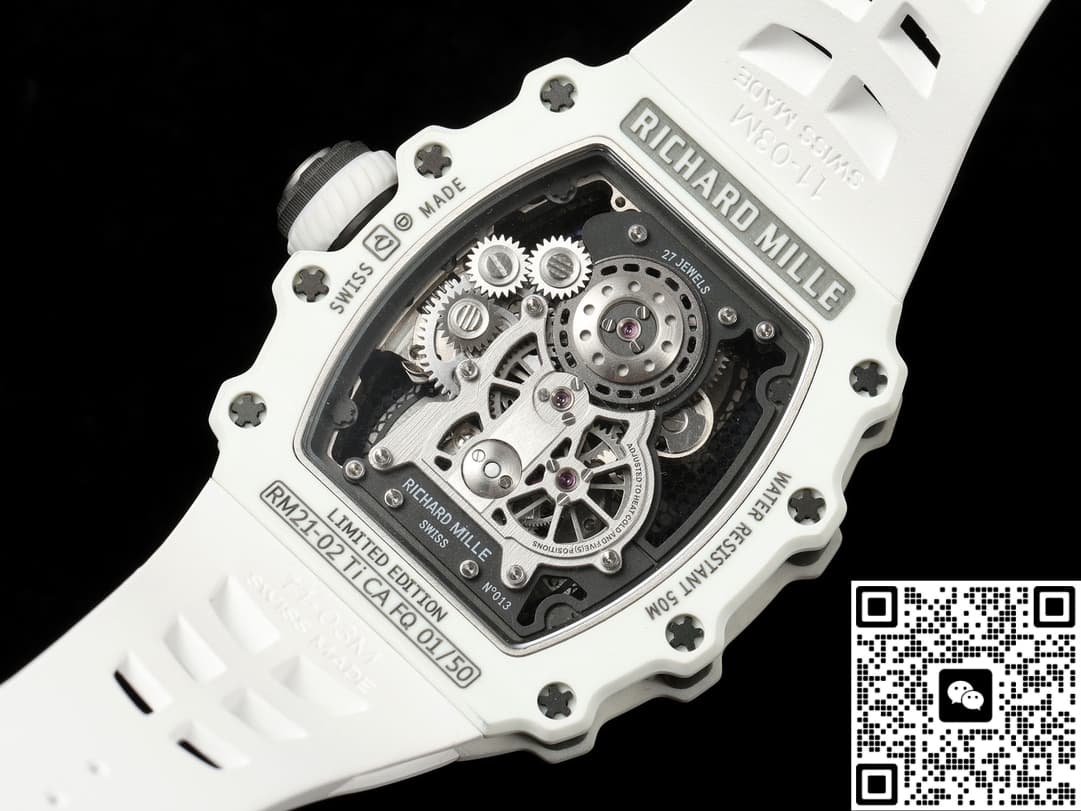 Friends who play high-end watches know that Richard Mill has never taken the usual path. Very recognizable, the design can be remembered at a glance, and the technology always likes to make some new breakthroughs, which is unique in the advanced watchmaking circle. Today, we are talking about the NEW Factory Richard Mille RM21-01 carbon fiber case 1:1 Best Edition Replica Watch. From the radian of the case to the polishing of the details, we can see that we have really studied the essence of the original, and the texture is very close to the original. The biggest concern is the movement. This RM21-01 is equipped with the super clone RM21-01 movement. Anyone who knows what to do knows that the movement is the soul of the watch. This movement not only matches the original appearance, but also stands the test of the stability when actually walking. Whether you want to wear it every day or just like to study mechanical watches, this one is worth taking a good look at in your hand. This manual mechanical movement highly restores the precise and complicated mechanical structure of the original movement, and the details are handled in a very good way. Let me tell you slowly below. Back through the bottom of the watch, you can enjoy the operation process and law of this watch and appreciate the beauty of machinery when you are in a daze and bored.