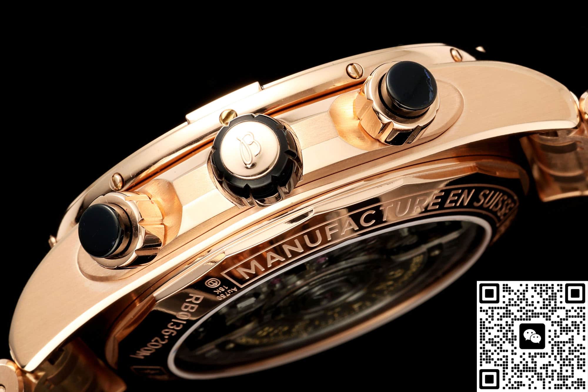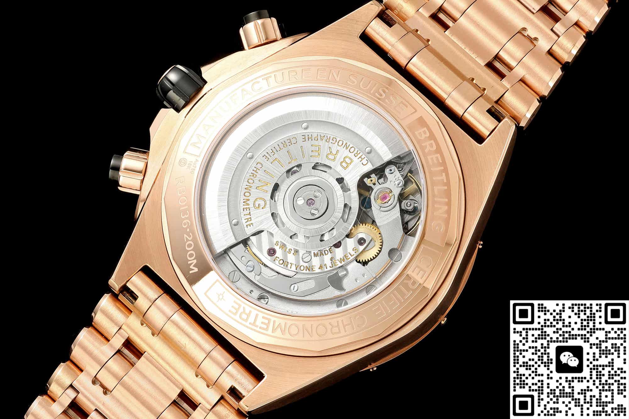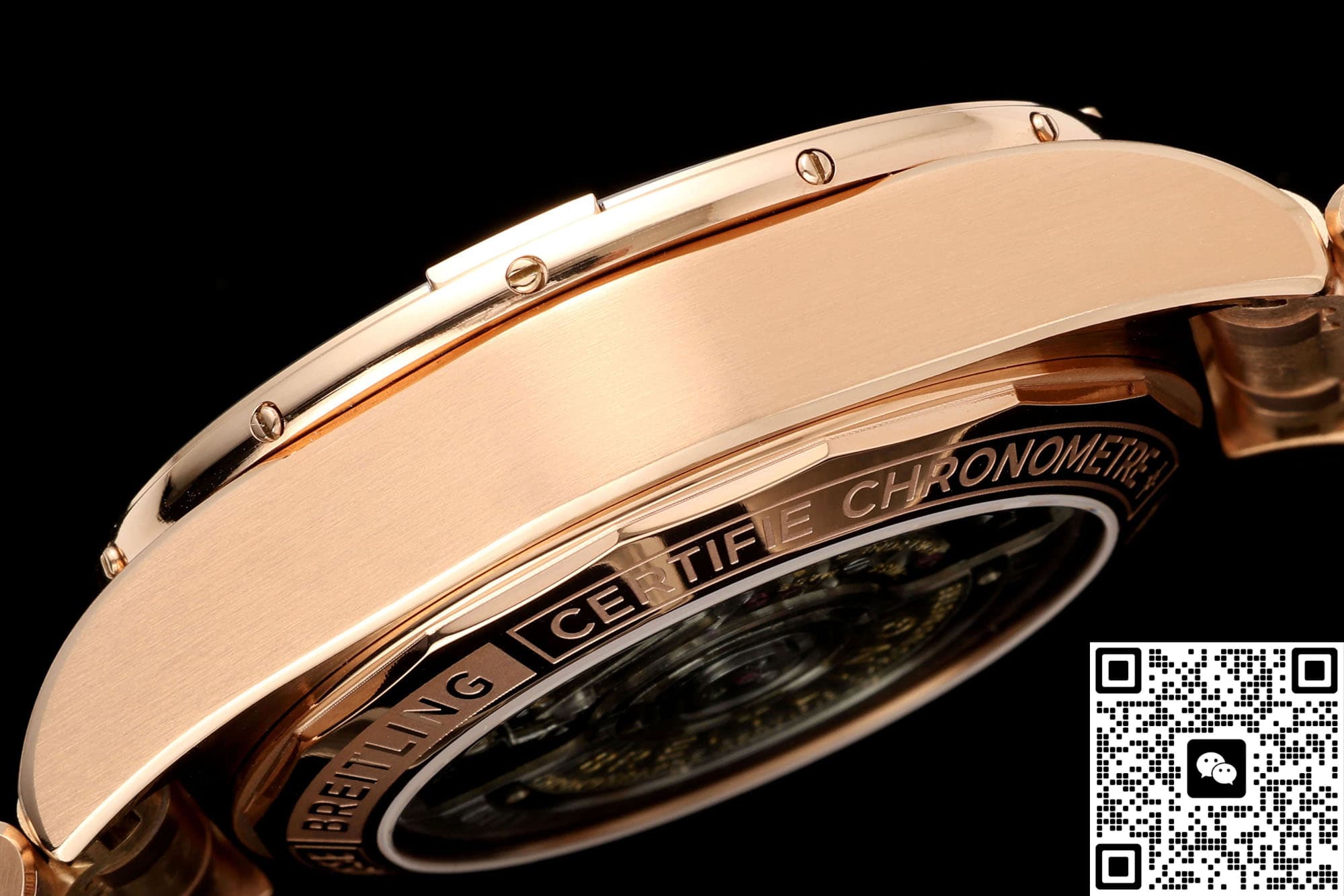 The key points of the TF factory’s modification lie in the automatic rotor and the engraving on the clamping plate. The automatic rotor is engraved with the BREITLING LOGO and the word “BREITLING”, and the main plate is polished with pearl texture. Through the transparent back design, it can be seen that the simulation effect of the movement’s appearance can reach 80%. However, upon closer inspection, it can be seen that the shock absorbers are Incabloc triangular shock absorbers, with shock absorption performance in the upper-middle range. It can also be observed that the balance wheel positions are different, and the fine-tuning device is a fast and slow needle instead of a free-sprung hairspring. These differences determine that it is impossible to achieve the same timekeeping accuracy as the genuine product. The daily error is within 12 seconds, which is a common error range for replica watches. This movement has a good winding efficiency. It is recommended to have it serviced every two to three years.