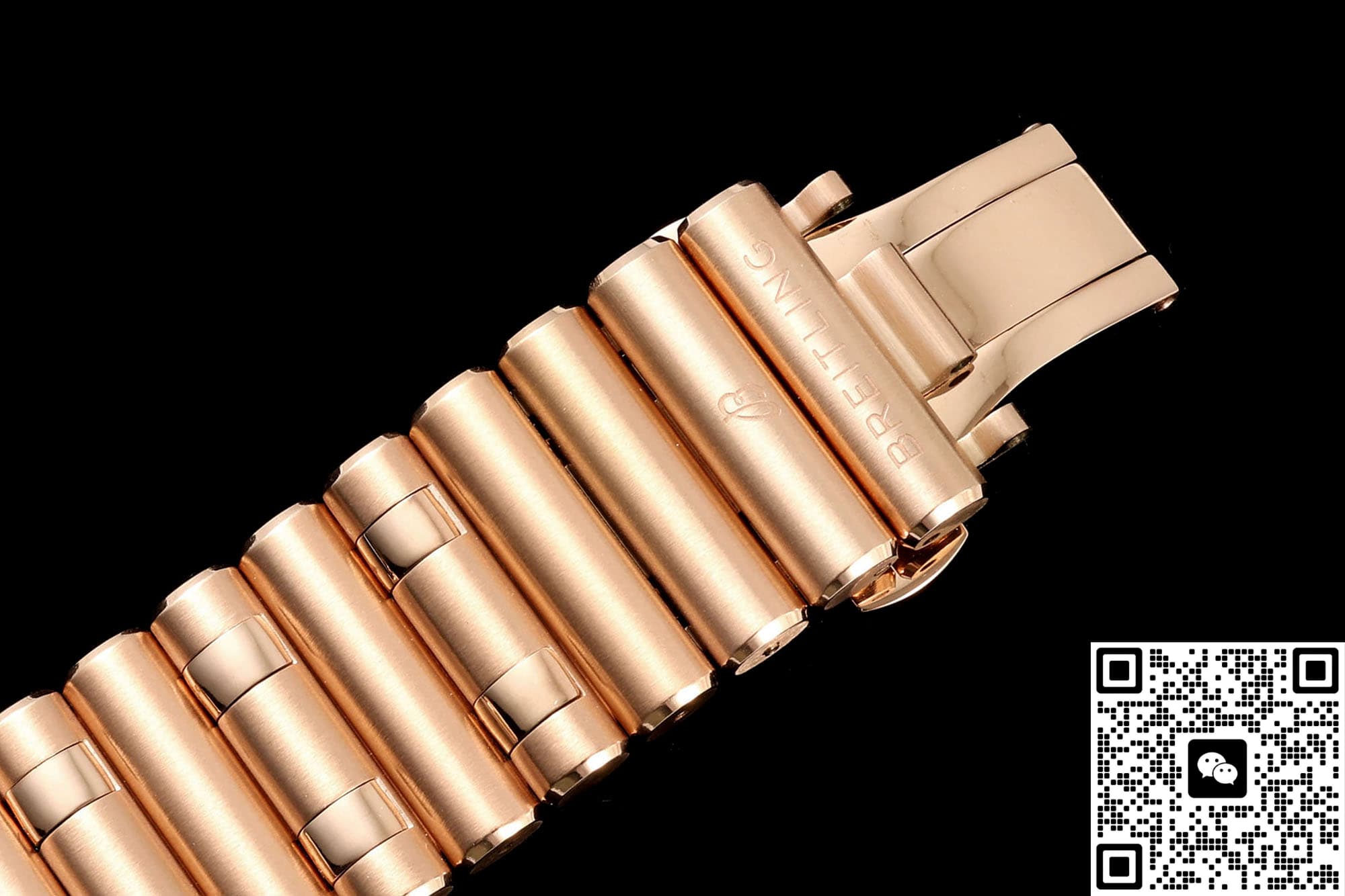 The TF Factory Breitling Chronomat RB01361A1L1S1 replica watch is equipped with a roller-beat-style gold-plated strap. It features a five-row link design, with each row of links independently polished to maintain a consistent luster. The engravings inside the watch strap are clear, and the butterfly clasp feels tight when opening and closing, without any sense of looseness. The 316L stainless steel base has undergone thick gold plating. The official claim is that it can achieve a 5μm gold plating layer. After three months of actual wearing, no obvious fading was observed. However, the inner side of the clasp showed a slight whitening due to friction. This is a common shortcoming of all gold-plated watch straps. It is recommended to wipe and maintain it in time when sweating a lot in summer.