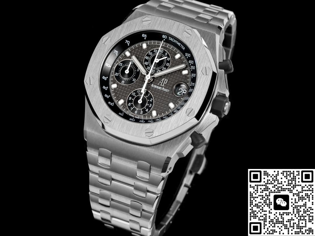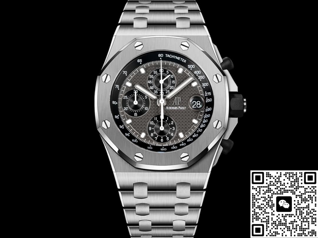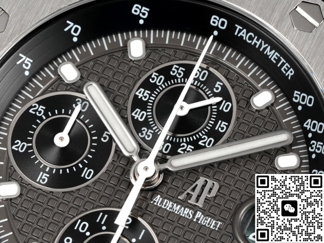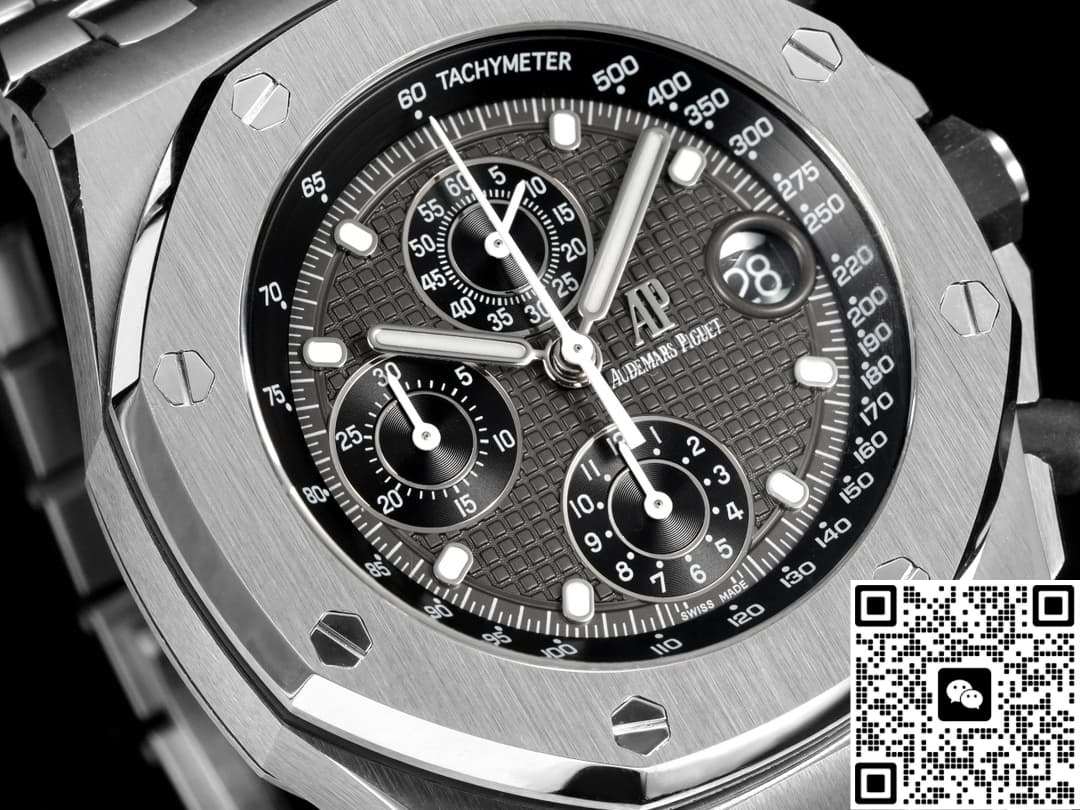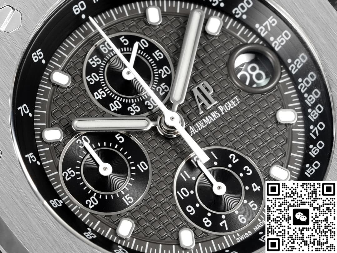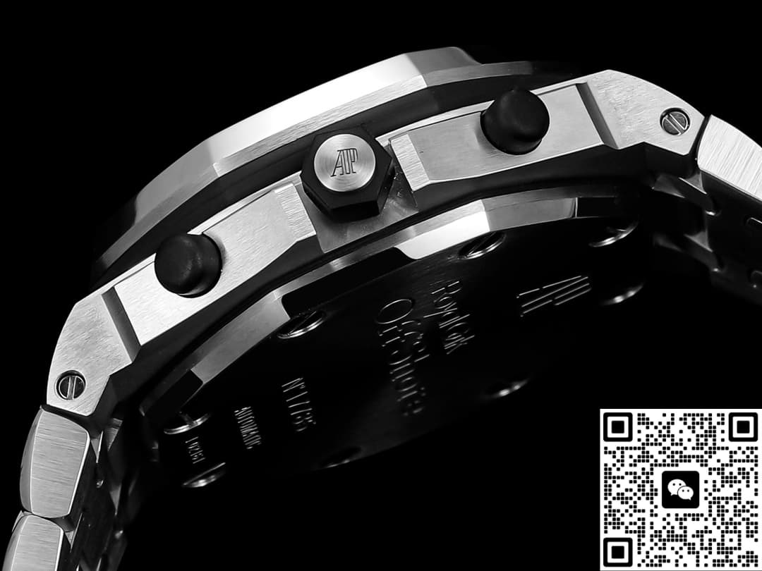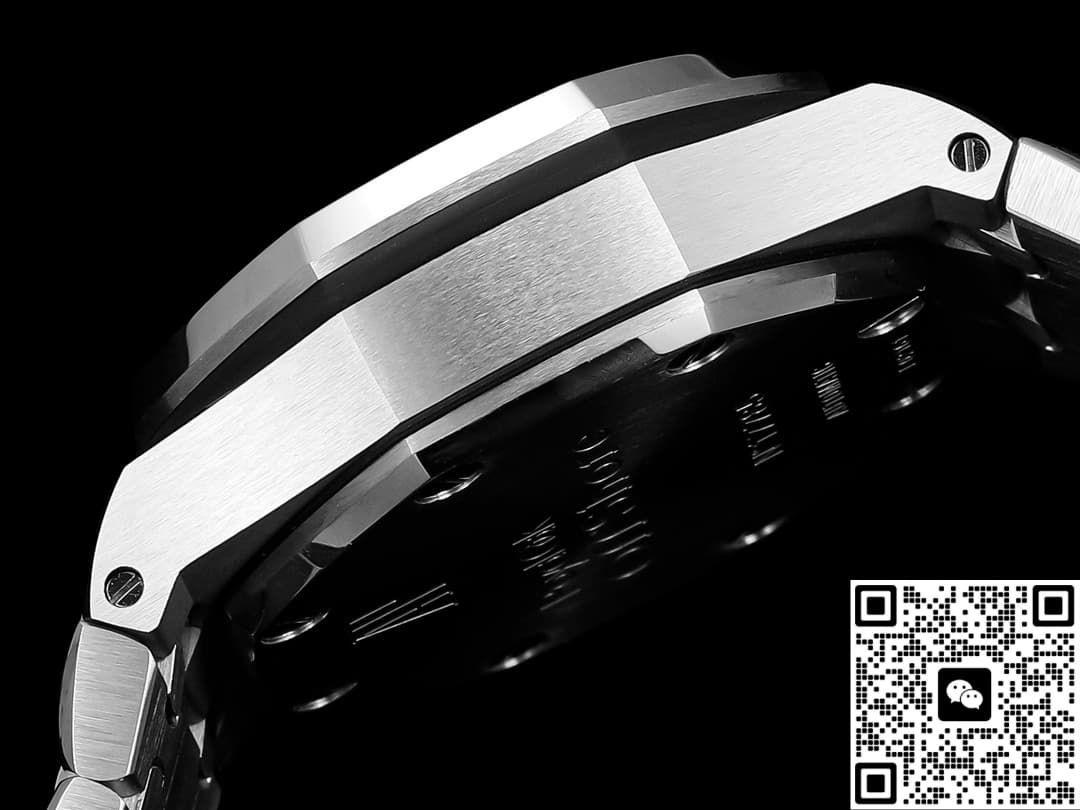 The TK factory’s Audemars Piguet 26238 TI.oo.2000 TI.01 replica watch is made of Grade 5 titanium, which is a top-quality material. Few replica manufacturers are willing to use this material because they all need to control costs. However, TK Factory is different. To enhance our wearing experience, we have invested heavily in using titanium metal material. This material has excellent corrosion resistance and very strong tensile strength, making it suitable for wearing in Marine climates. The disadvantage of titanium metal is that it is relatively soft. Strong impacts may cause scratches and depressions. Moreover, it is more difficult to process than stainless steel and is slightly rougher compared to stainless steel. This is also a limitation of the physical material. The brushed finish on the case is treated with a vertical process, with a texture depth of approximately 0.03MM. Under light, a fine and uniform texture can be seen, and the metallic luster is close to that of the genuine product. The inner chamfer of the lugs is slightly rounded. The screw-down crown feels tight when rotated. It is equipped with a waterproof gasket and claims to be water-resistant up to 100 meters. However, be cautious when wearing it for swimming. It is not recommended to try it.