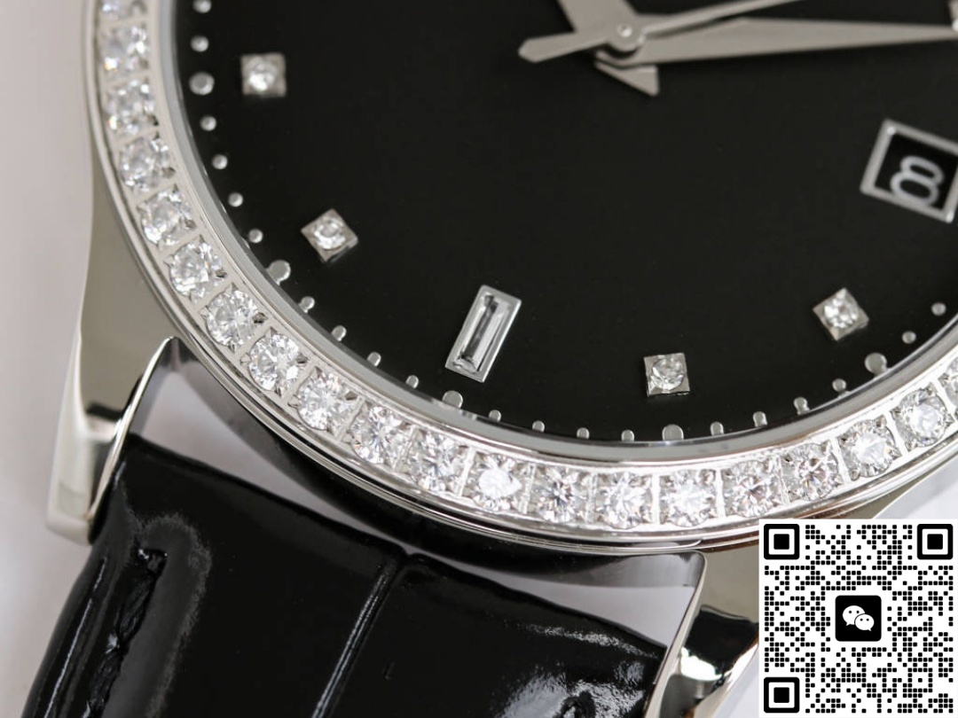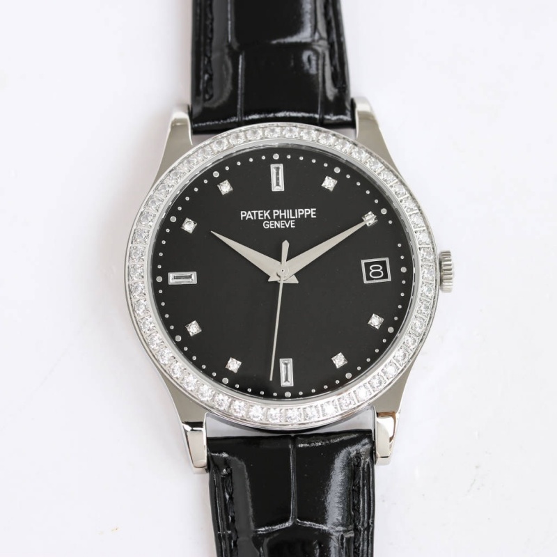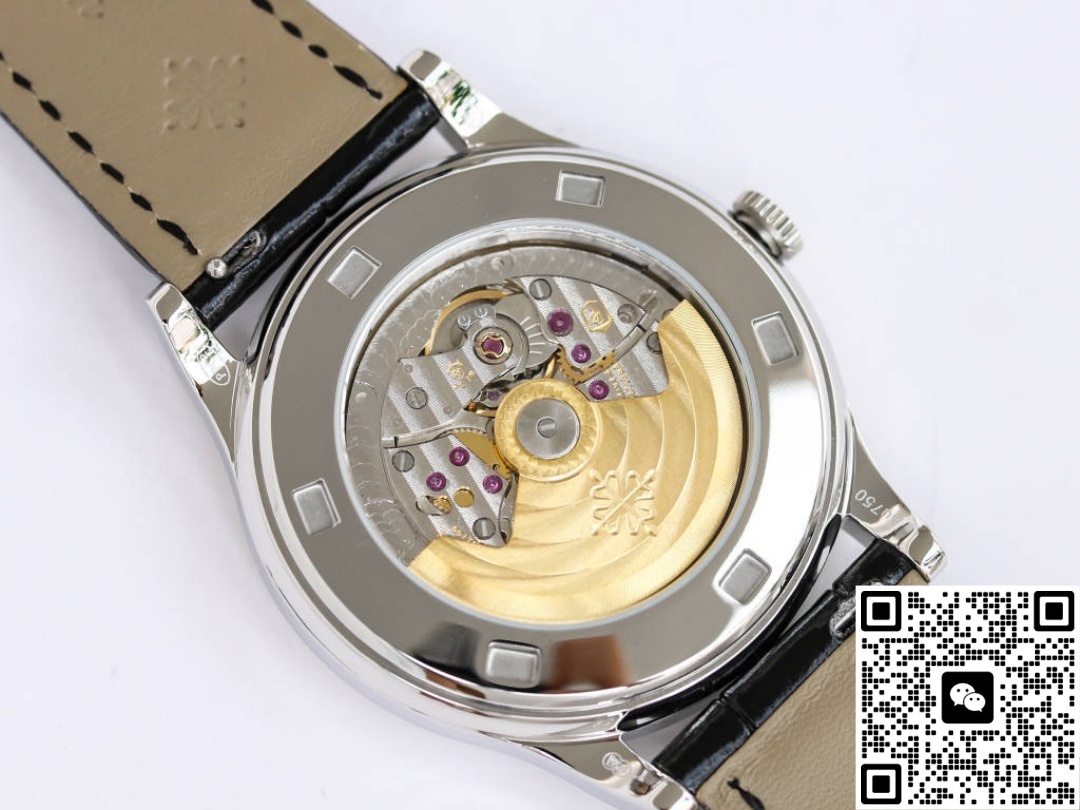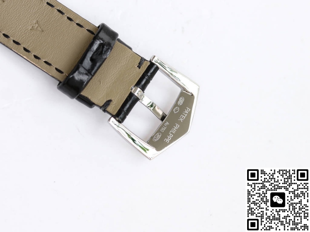 Patek Philippe Classic Watch Series 5297G-001 is a formal watch, so its dial design is relatively simple. If you like this simple and elegant watch, you can consider this one. The dial color is pure black and decorated with diamond hour markers, which is very beautiful. And the diamond hour markers echo the diamonds on the bezel. The engraving on the dial is very clear. Simple three-pin design, the hands are polished without any burrs. There is a calendar window at the 3 o’clock position. The edges of the window are sharply cut, and the fonts are clear, three-dimensional and layered. There is Patek Philippe’s logo on the crown, and the details are well handled. This Patek Philippe watch from the TW factory has solid workmanship and a very high degree of restoration, so it is worth considering.