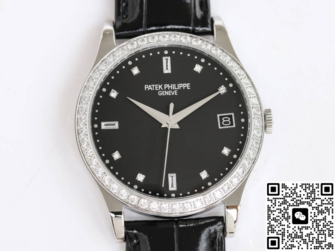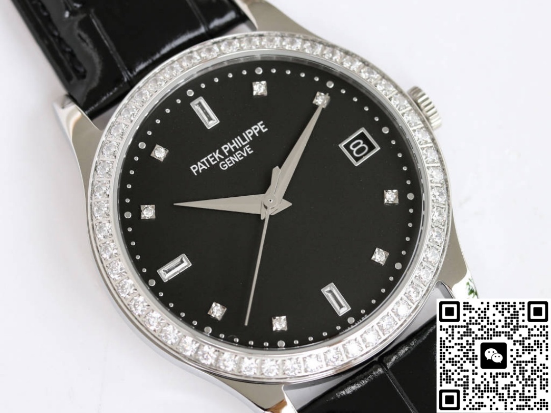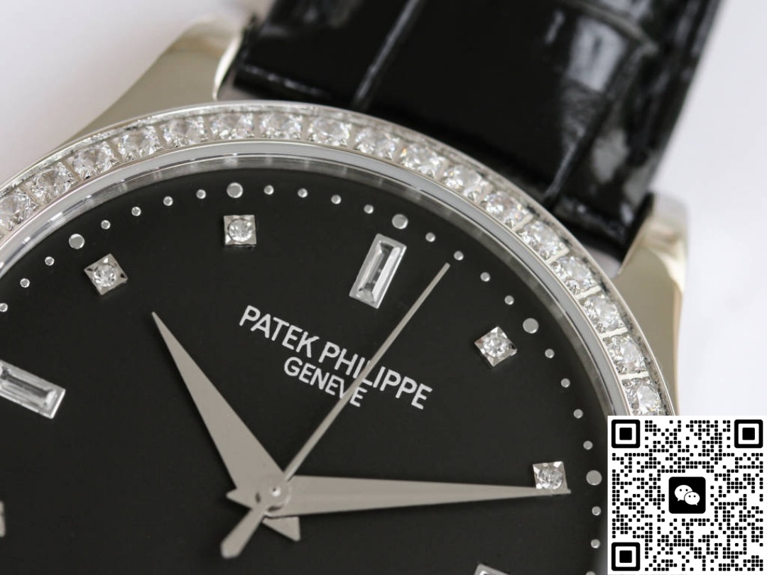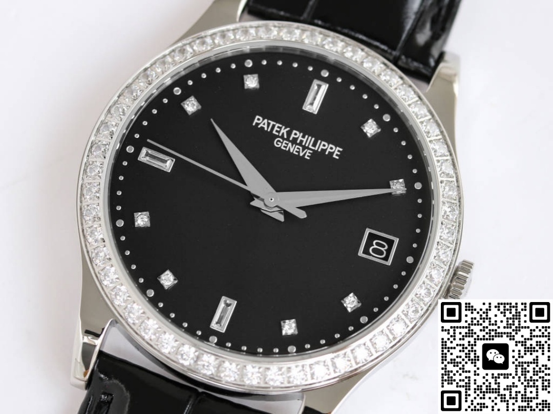 Patek Philippe Classic Watch Series 5297G-001 is a formal watch, so its dial design is relatively simple. If you like this simple and elegant watch, you can consider this one. The dial color is pure black and decorated with diamond hour markers, which is very beautiful. And the diamond hour markers echo the diamonds on the bezel. The engraving on the dial is very clear. Simple three-pin design, the hands are polished without any burrs. There is a calendar window at the 3 o’clock position. The edges of the window are sharply cut, and the fonts are clear, three-dimensional and layered. There is Patek Philippe’s logo on the crown, and the details are well handled. This Patek Philippe watch from the TW factory has solid workmanship and a very high degree of restoration, so it is worth considering.