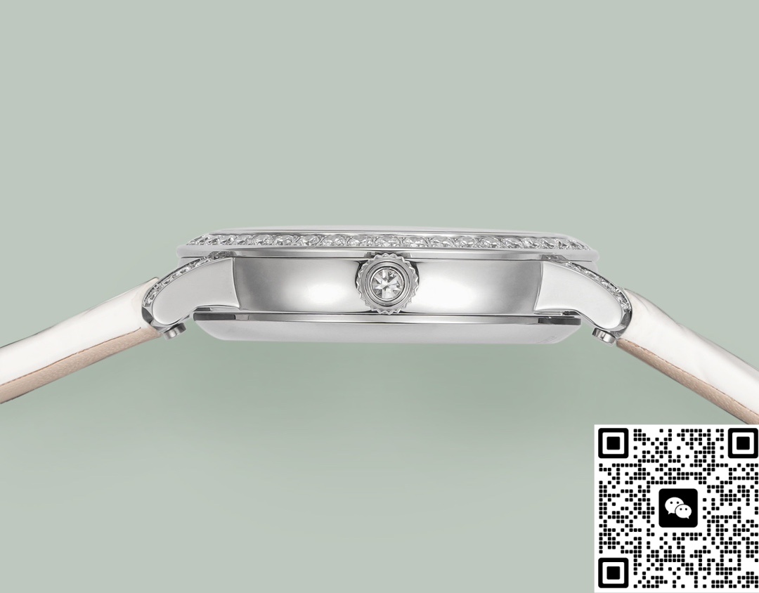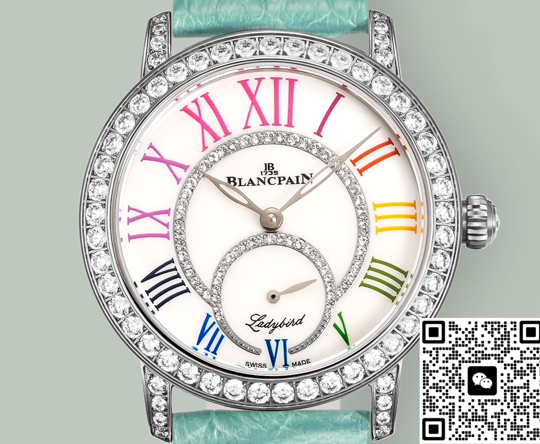 Blancpain has attracted much attention in recent years and has also brought a wave of traffic. The replica market has also joined in. V+ Factory is a factory specializing in women’s watches, so it has also caught this wave of popularity. Let’s take a look at the V+ Factory Blancpain LADYBIRD 3661A-1954-95A replica watch and see if it meets everyone’s expectations. Let’s evaluate it together and see what the differences are from the genuine product. This model is of the same size as the genuine one, being 34.9mm. The data is quite accurate and it is also a very suitable wristwatch for women to wear. The case of the watch is made of high-quality stainless steel, while the genuine one is made of 18K white gold. However, after being polished by V+ Factory, the luster and texture it presents are also very close to the genuine one. What is particularly worth mentioning about this wristwatch is that the bezel, lugs and dial are all set with diamonds. The diamonds used by V+ factory are high-quality artificial diamonds, all of which have been strictly selected. The cuts are relatively neat and the fire effect is also certain. The inlaid arrangement is neat and tidy, and it is also quite enjoyable visually.