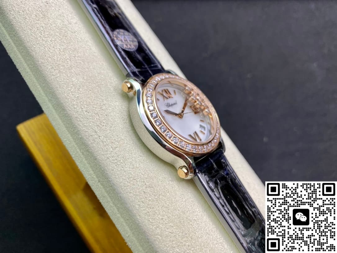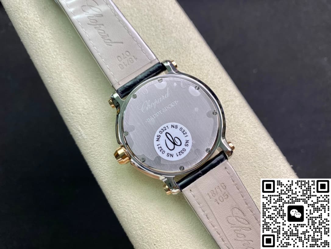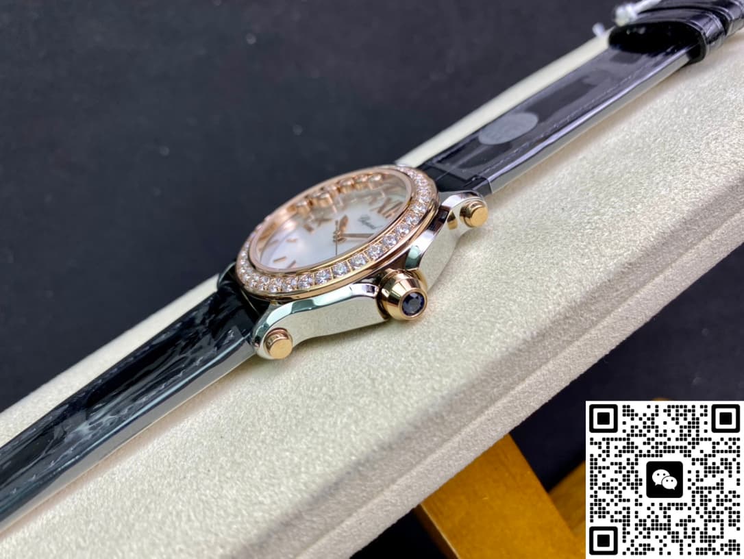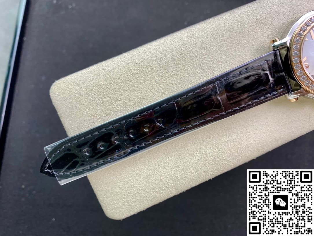The Chopard Happy Diamond 278492-9004 replica watch from YF factory is mainly made of 316L stainless steel, and the bezel achieves an 18K rose gold effect through nano-electroplating. The measurement revealed that the case diameter was 36MM and the thickness was approximately 9MM, which was consistent in height with the genuine product. The two-tone combination of stainless steel and rose gold creates a more distinct visual effect. The color durability is longer than that of the fully gold-plated model. The hardness of the stainless steel base is also relatively high, and it will not easily change color during practical use. The nano electroplating color can be maintained for a longer time. The bezel is also set with high-quality artificial diamonds, which are exquisitely cut, of uniform size and have an excellent fire effect. Under strong light, the fire can rival that of the genuine product. It is much better than cheap diamonds and the photo-taking effect is also excellent. YF Factory has adopted the prong setting technique in its setting process. Each prong is extremely fine and well done, capable of firmly fixing the diamond on the bezel. When rotating the watch, the fire effect is also relatively uniform, which is the quality of the high-end Chopard Happy Diamond replica watch.