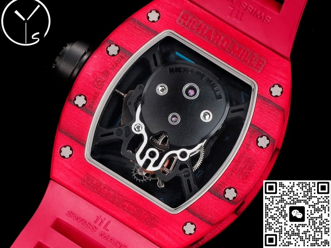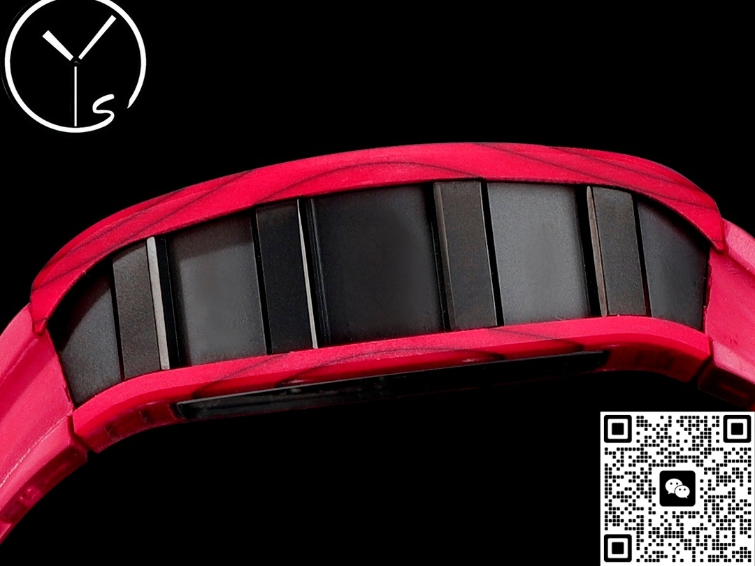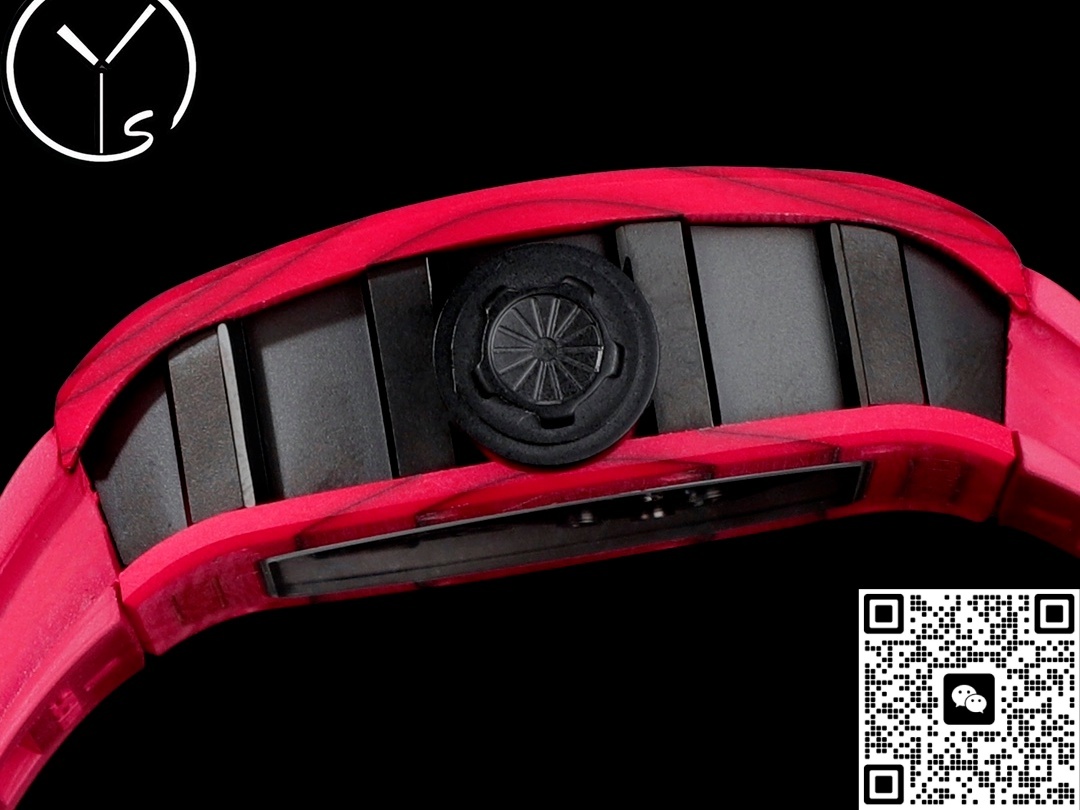 After our genuine testing, the case of the Richard Mille RM52-01 from the YS factory is made of carbon fiber. The case is red carbon fiber with fine linear patterns on the surface. Carbon fiber has many advantages, with the most prominent feature being its lightness and wear resistance. Its density is very low, so when worn, you hardly feel its weight. Carbon fiber also has extremely high corrosion resistance, making it very suitable for wearing in outdoor, racing and other environments. There are also 12 flower-shaped screws on the bezel, which is a classic element of Richard Mille. They not only serve a fixing function but also have an aesthetic effect.