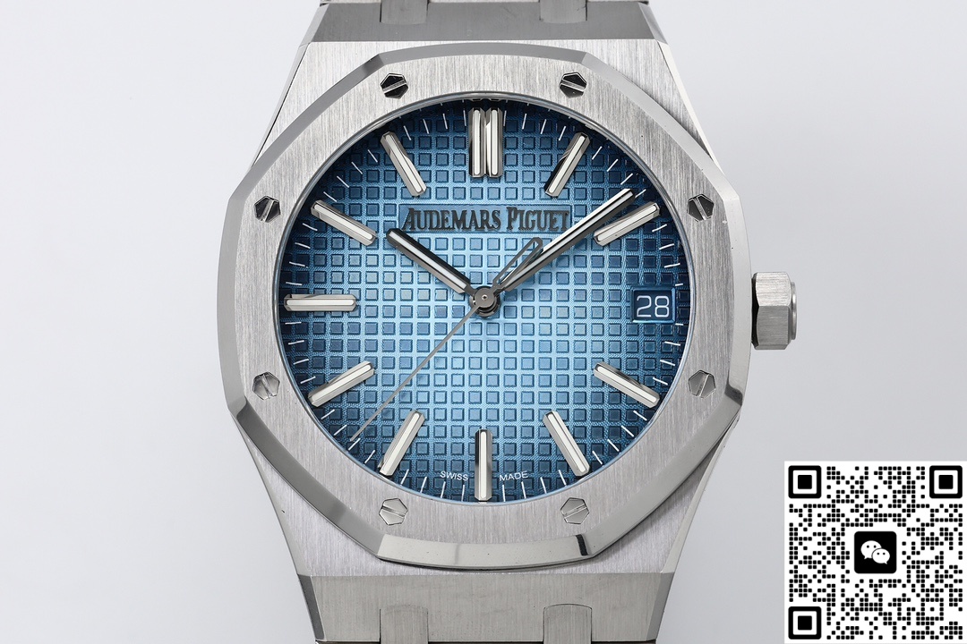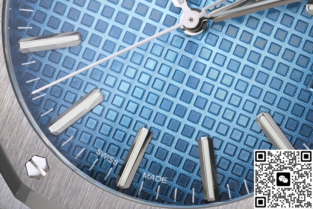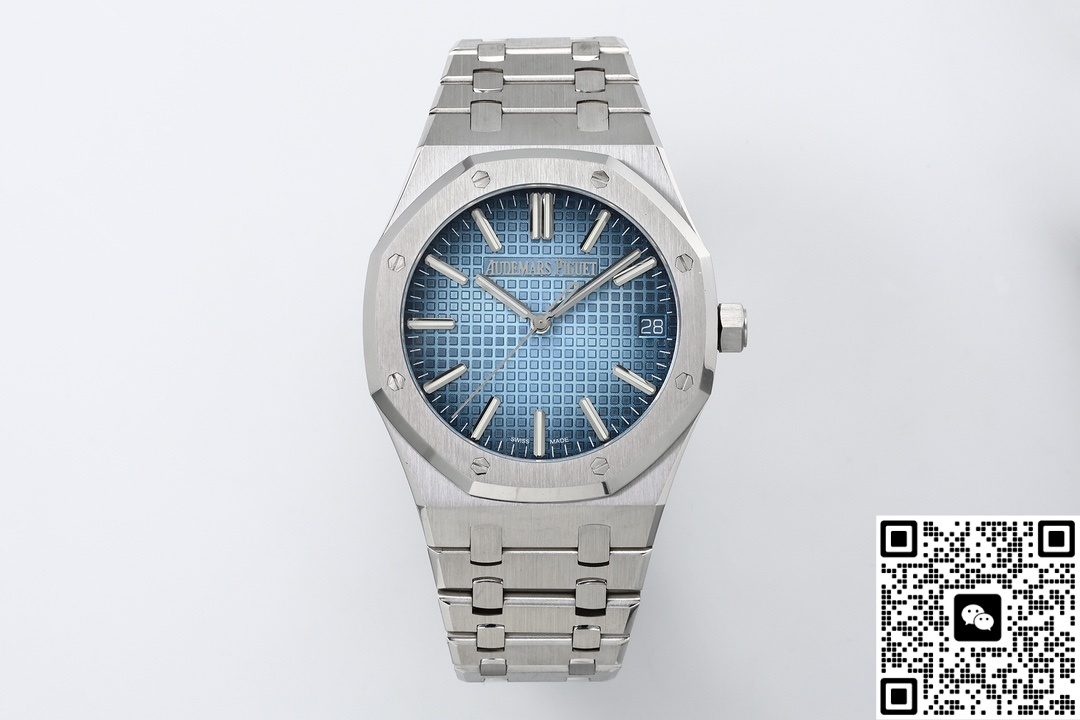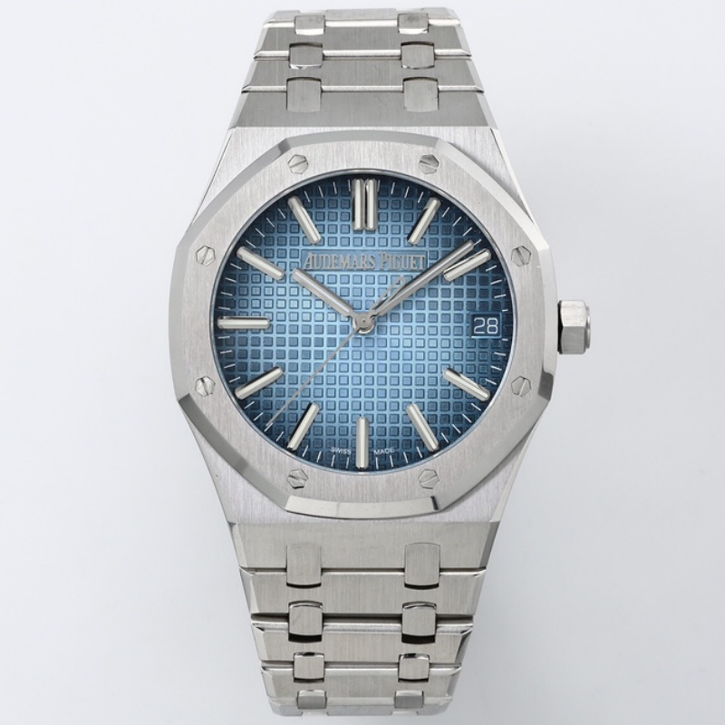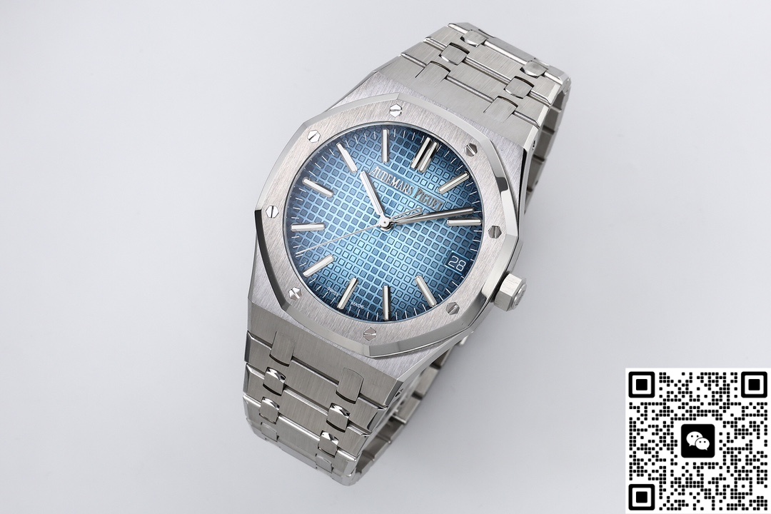 Let’s take a look at the material aspect together. ZF Factory is also very meticulous in terms of materials. The ZF factory Audemars Piguet Royal Oak 15510BC.OO.1320BC.02 replica watch features a classic sapphire crystal crystal that is very transparent. The case material is 316 stainless steel. So, what makes it superior to other steels? The steel of this watch has a carbon content of ≤0.045%, a nickel content of ≥10%, and a corrosion resistance index PREN of ≥26, reaching medical grade. The anti-corrosion performance has been significantly enhanced, making it particularly suitable for corrosive environments such as contact with seawater and sweat. Even after long-term wearing, it will not show signs of rust or discoloration. This material also has good ductility and toughness, which is convenient for processing complex shapes. The luster presented after grinding and brushing is very textured. Other factories do not use as much material and cannot produce such a texture. ZF factory gives you a different experience. The secret to making the smoky blue dial lies in the advanced physical vapor deposition (PVD) technology. First, the base of the dial is polished to ensure a smooth surface. Then, in a high vacuum environment, the metal target material is evaporated and deposited onto the surface of the dial. By precisely controlling the coating time and temperature, the desired blue tone is achieved. Subsequently, multi-layer coating technology is applied. Finally, the desired gradient smoke effect is obtained. Then, it is baked at high temperature to make the color last longer and not change color easily.